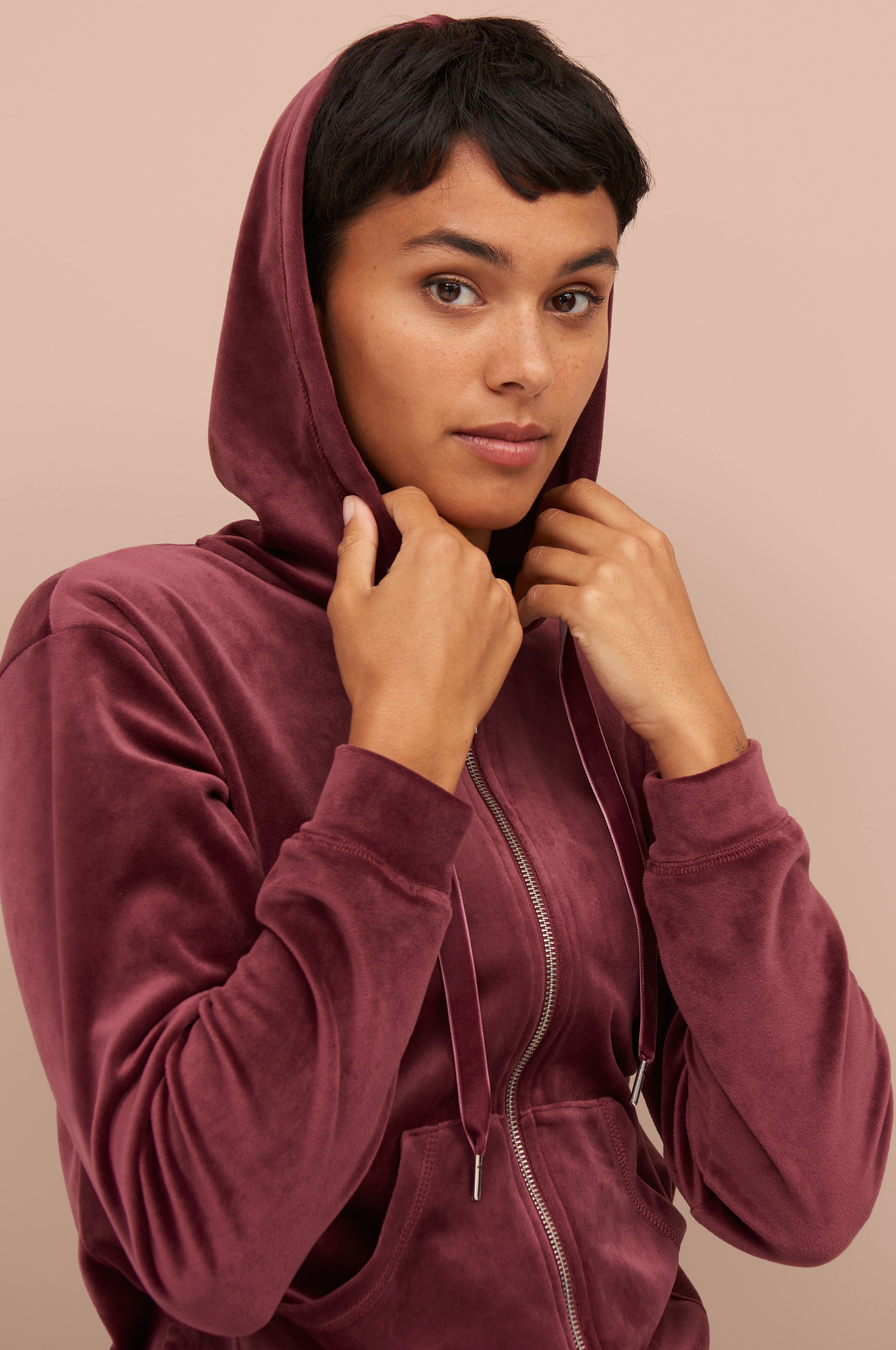 Edessä vetoketju ja taskut. Hupussa nyöri. Pehmeää ja hohtavaa veluuria. Pituus n. 60 cm koossa 34/36.