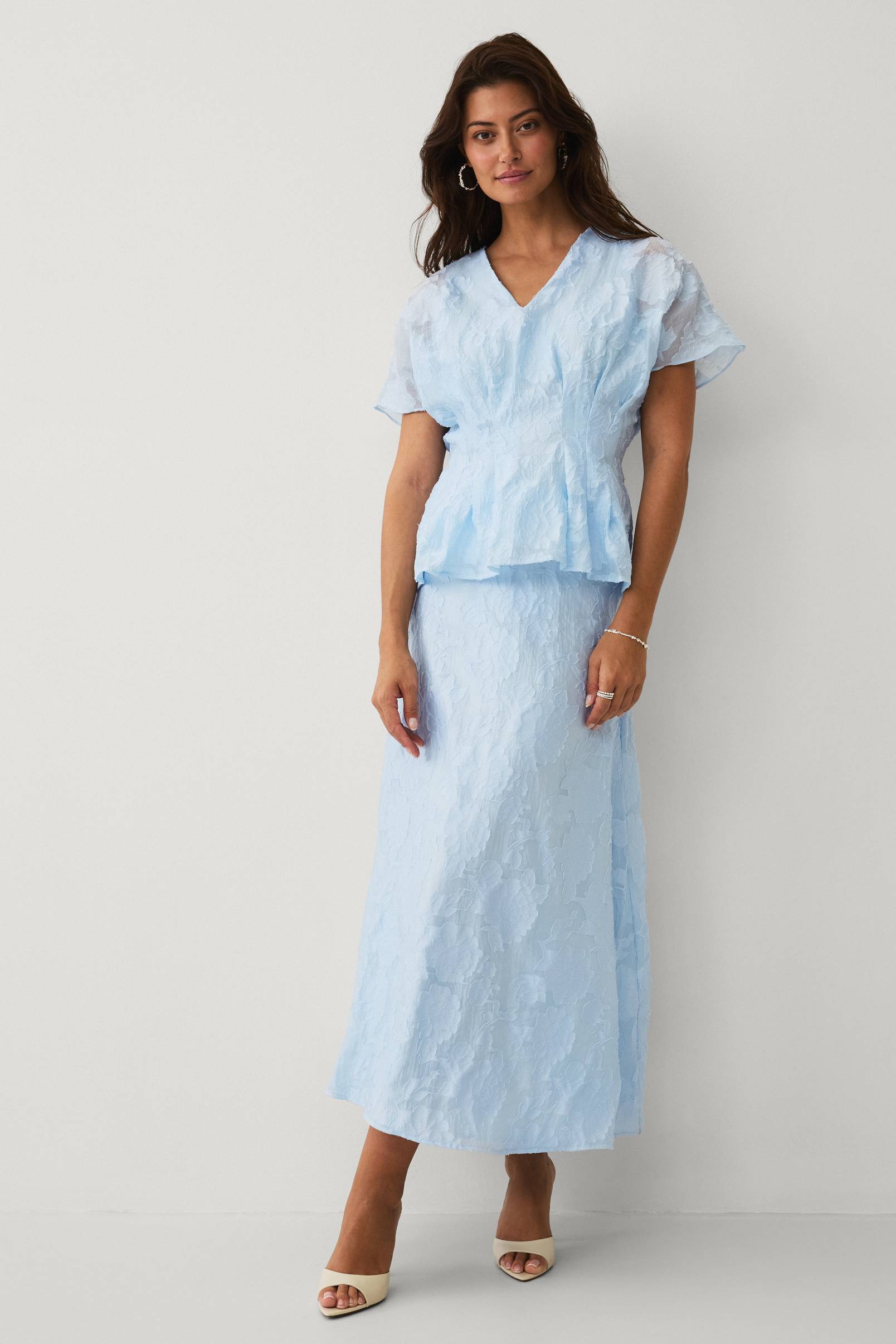 • Nilkkapituinen, jacquard-neuloksinen hame kukkakuviolla• Levenevä malli• Kuminauha vyötärön takaosassa• Kätketty vetoketju sivulla• Vuorattu