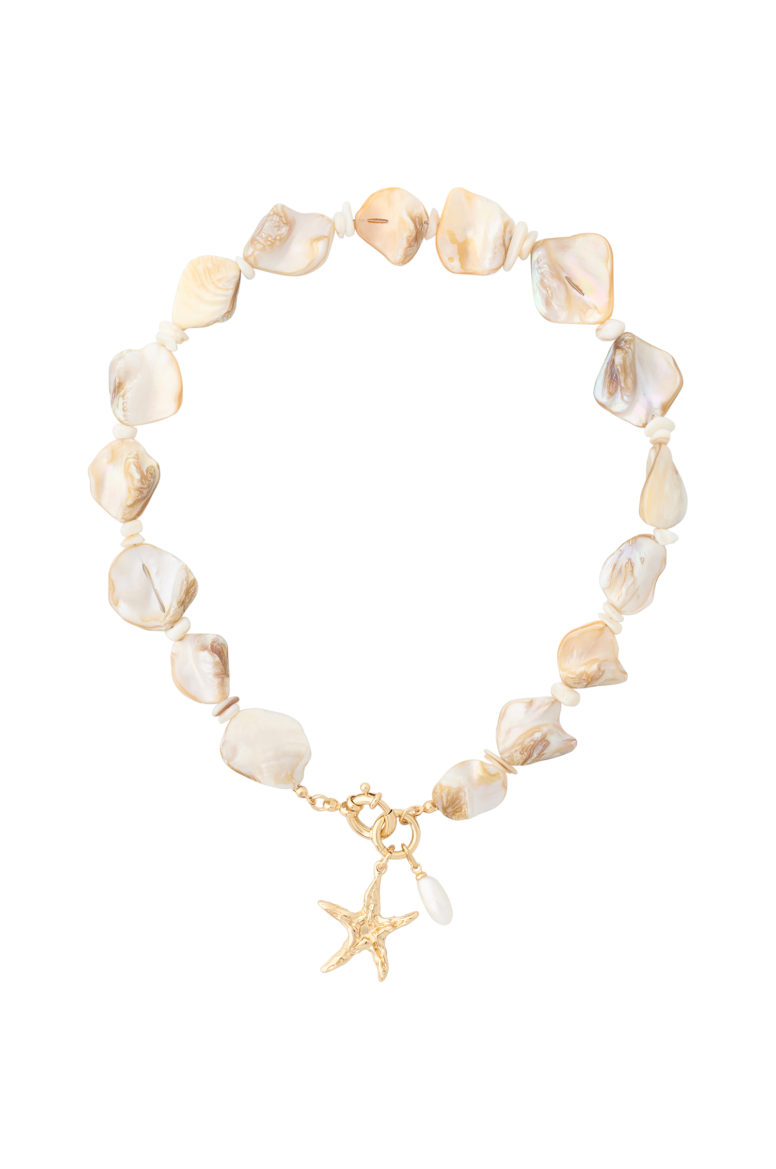• Kaulakoru sinkistä ja messingistä helmiäishohtoisilla simpukoilla• Koristeellinen, roikkuva meritähti yhdellä makeanveden helmellä