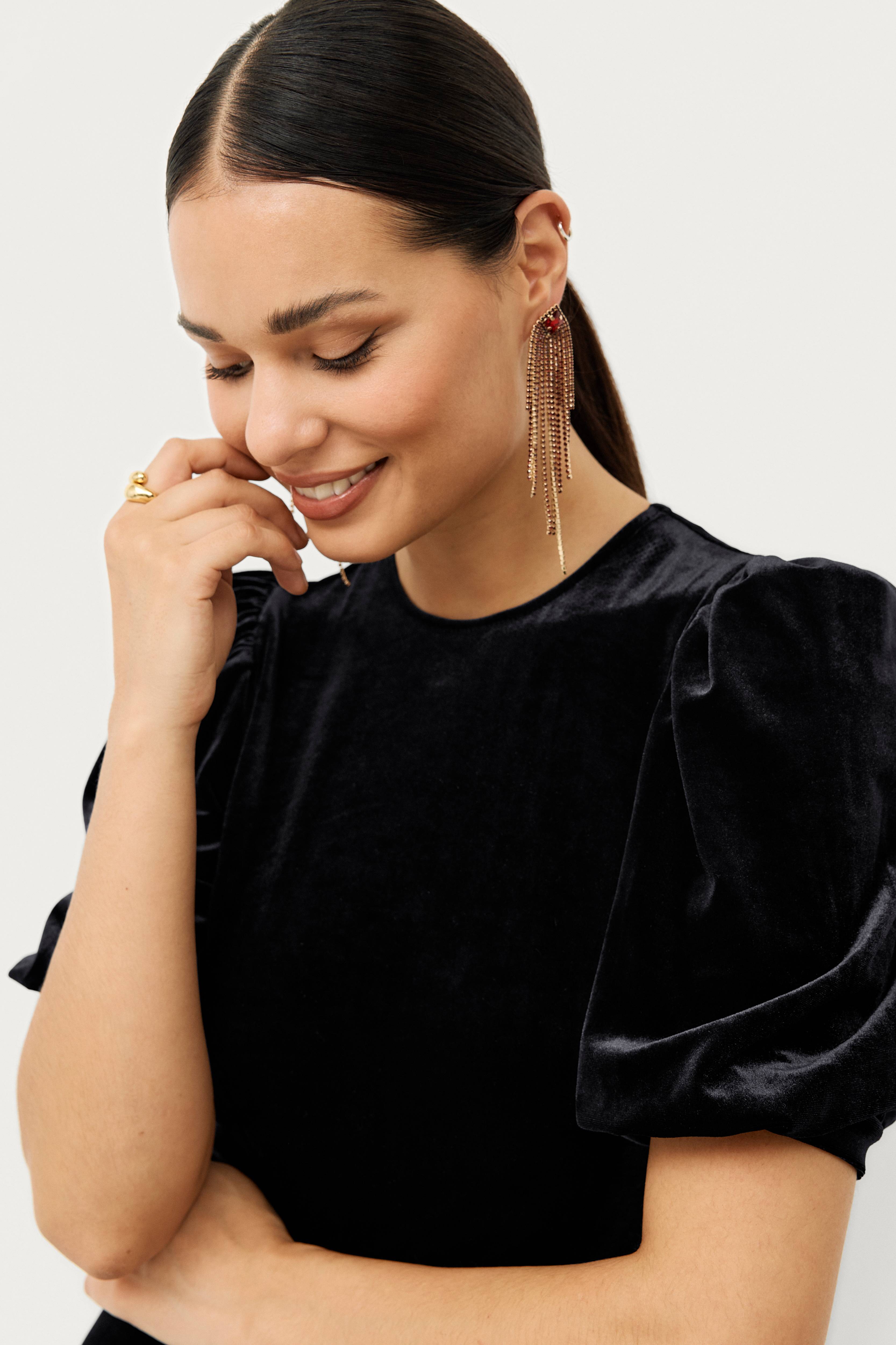Nappikorvakorut kullanväristä metallia ja punaisia kiviä.Pituus 129 mm, leveys n. 23 mm.85% lasia ja 15% messinkiä.