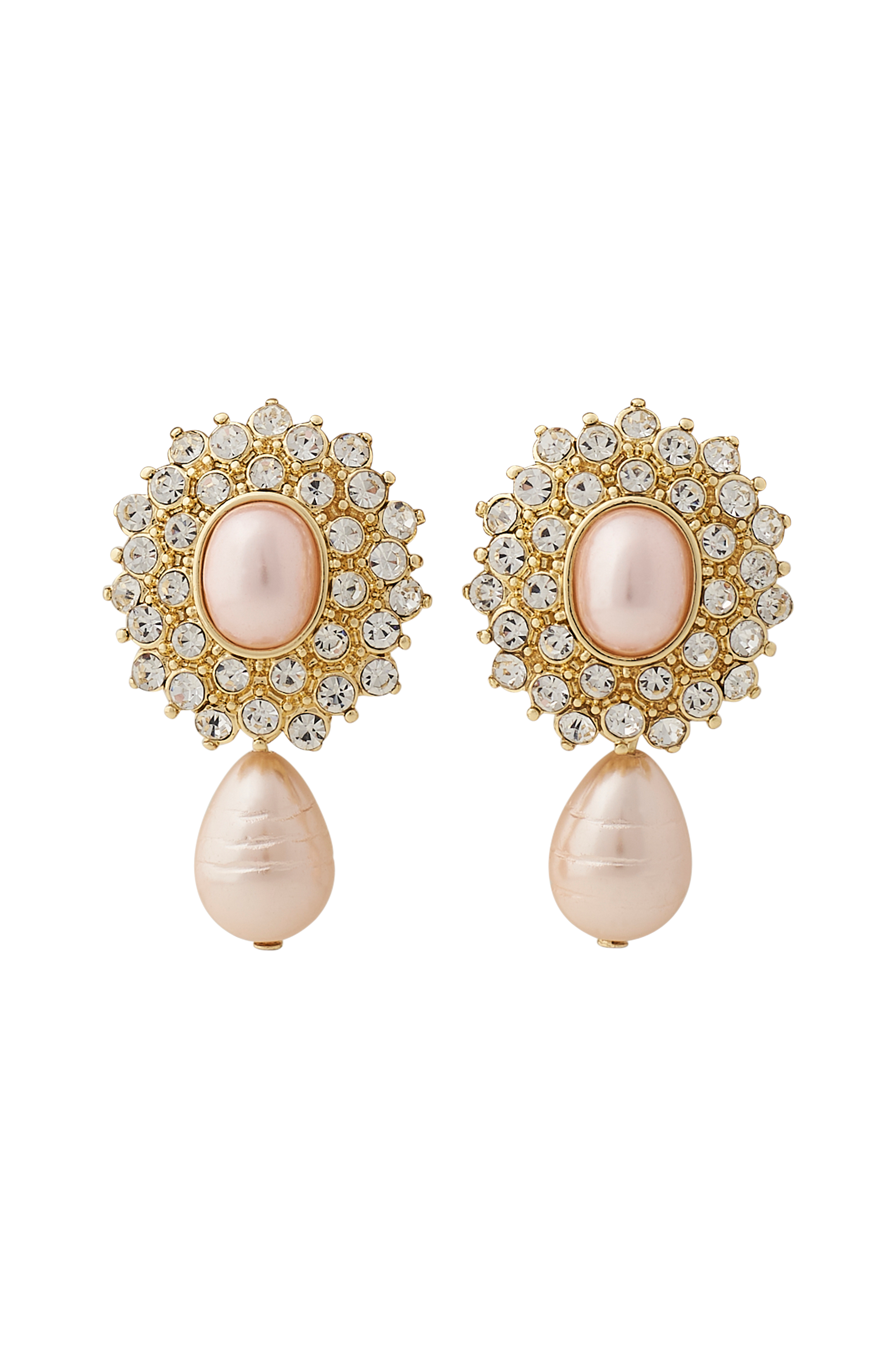 Kimaltavat korvakorut, joissa strasseja ja riippuva makeanvedenhelmi. Leveys n. 2,2 cm, pituus n. 3,7 cm.