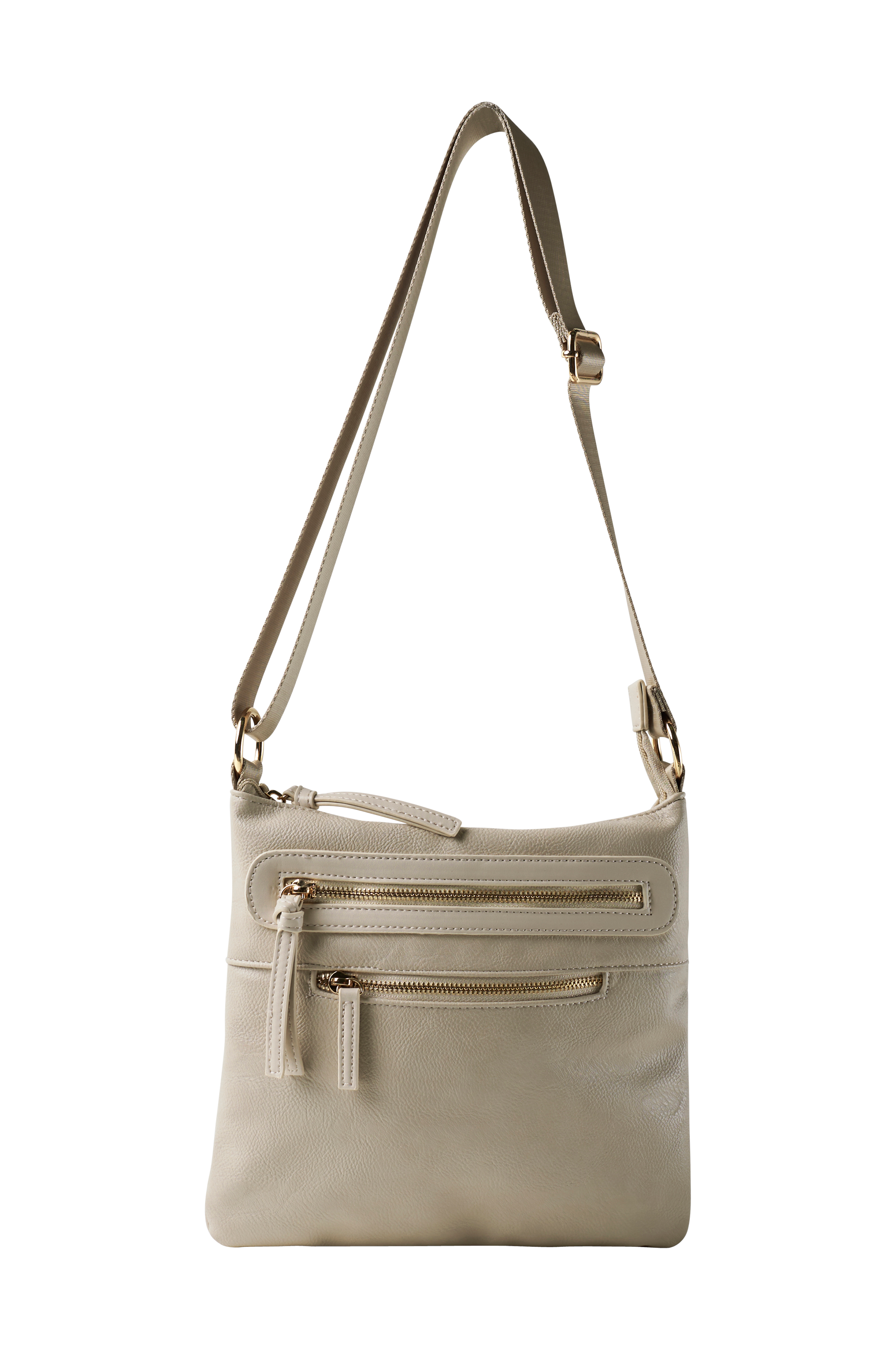 • Laukku keinonahasta • Vuorattu sisäpuoli yhdellä vetoketjutaskulla ja kahdella pienellä osiolla • Kaksi vetoketjutaskua ulkopuolella • Säädettävä olkain • Mitat: B 26 x H 25 x D 2 cm