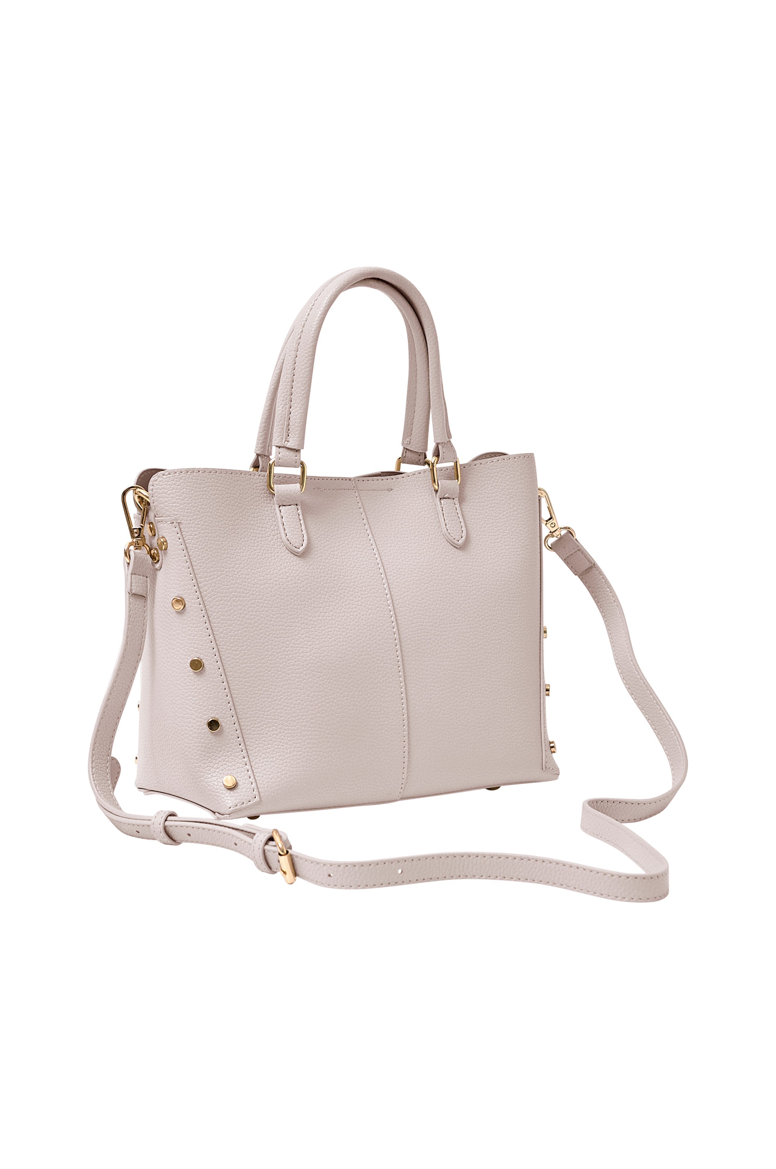 Pieni käsilaukku, jossa irrotettava olkahihna. Nahkajäljitelmää, kangasvuori. Vetoketjulokero sisäpuolella. Kullanväriset koristeniitit sivulla.Mitat n. L 24 x K 20 x S 10 cm.