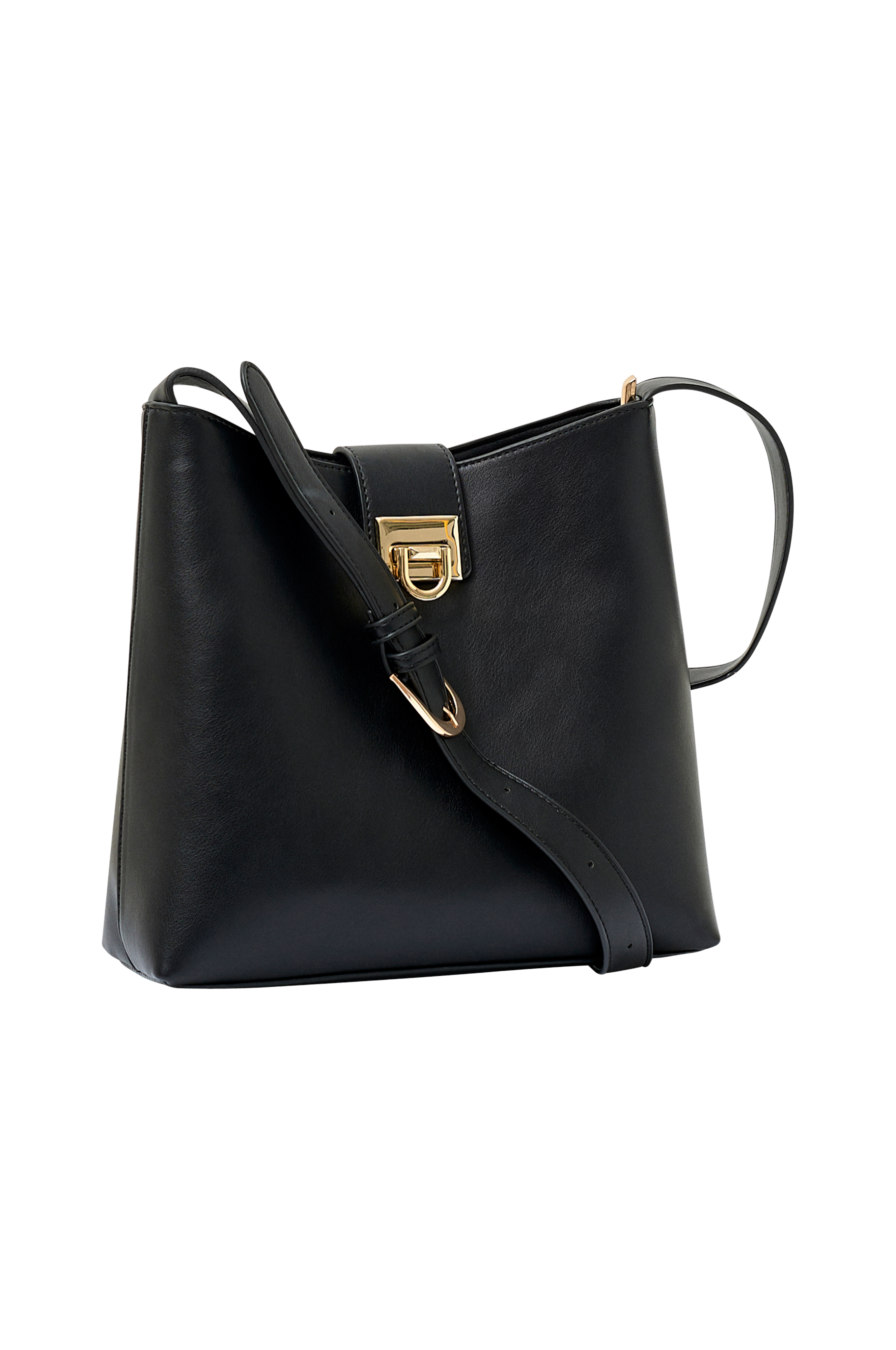 Tyylikäs laukku nahkajäljitelmää. Pitkä, säädettävä olkahihna. Laukku suljetaan ylhäältä vetoketjulla ja kullanvärisellä soljella. Sisällä kangasvuori, kaksi vetoketjullista lokeroa ja slip in -lokero. Mitat n. L 26 x K 23 x S 8 cm.