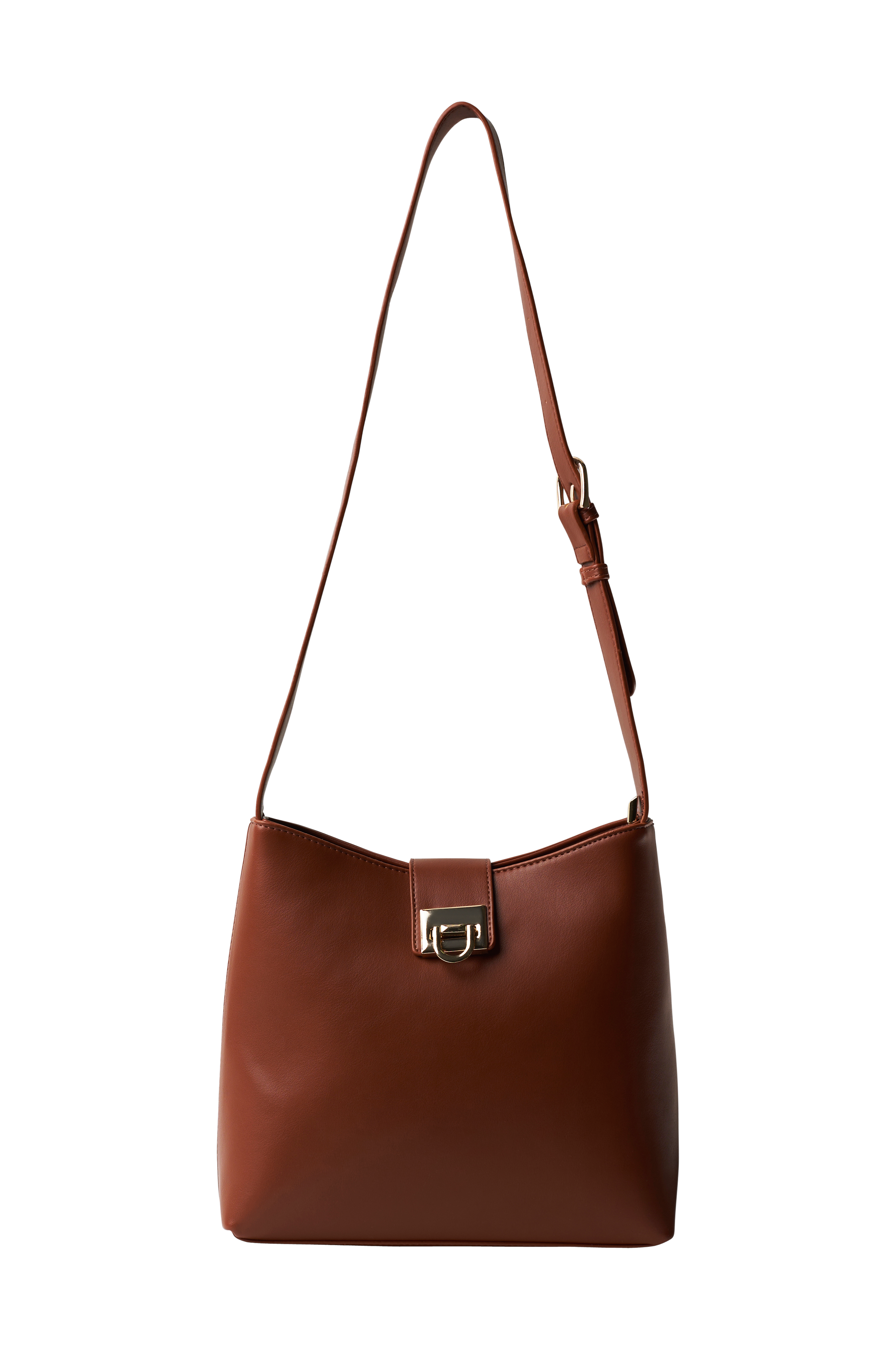 Tyylikäs laukku nahkajäljitelmää. Pitkä, säädettävä olkahihna. Laukku suljetaan ylhäältä vetoketjulla ja kullanvärisellä soljella. Sisällä kangasvuori, kaksi vetoketjullista lokeroa ja slip in -lokero. Mitat n. L 26 x K 23 x S 8 cm.