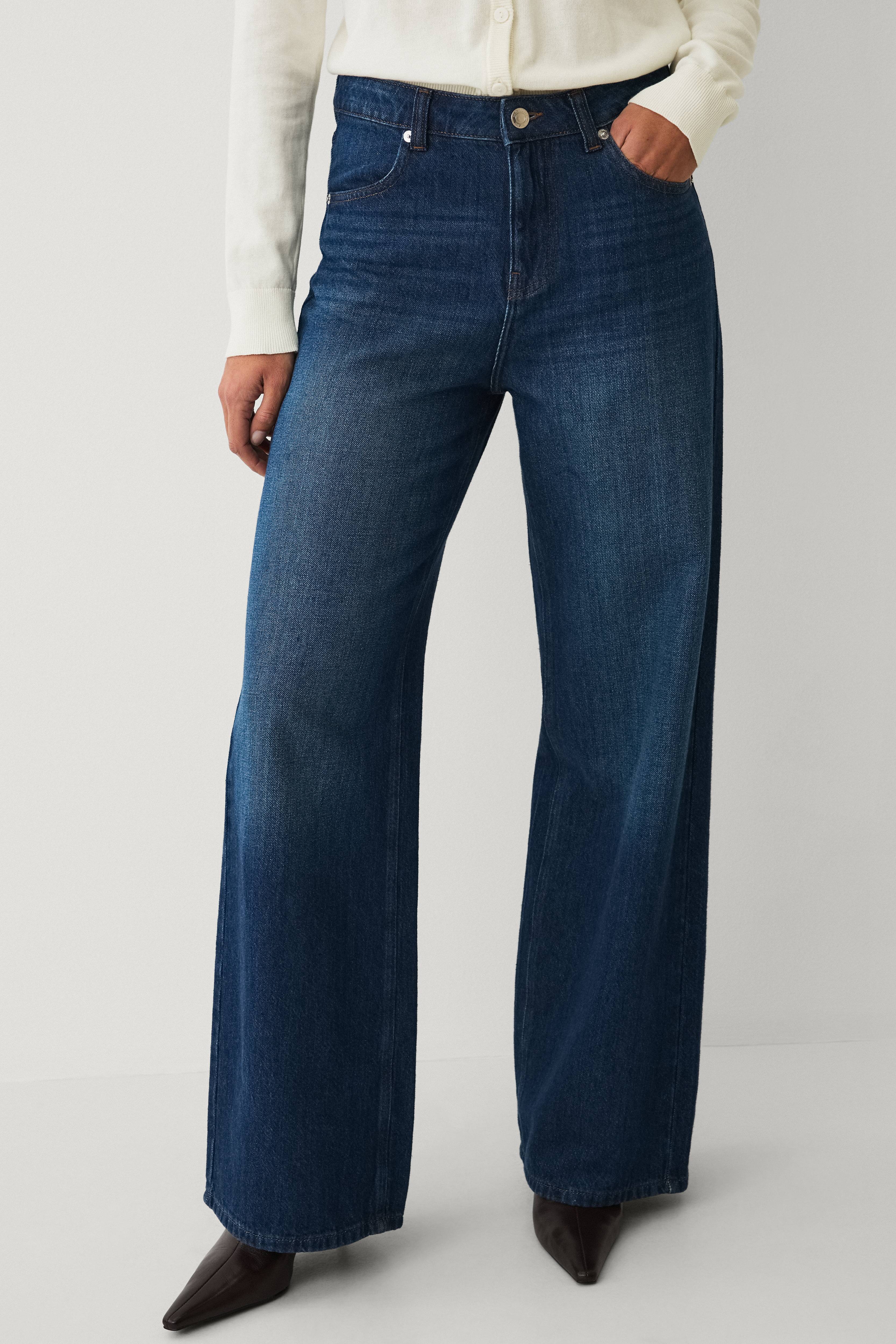 • Leveät farkut korkealla vyötärölinjalla• Vyölenkit• Vetoketju ja napitus• Kaksi etutaskua• Kaksi takataskua• Lahkeen sisäpituus: 84 cm koossa 36
