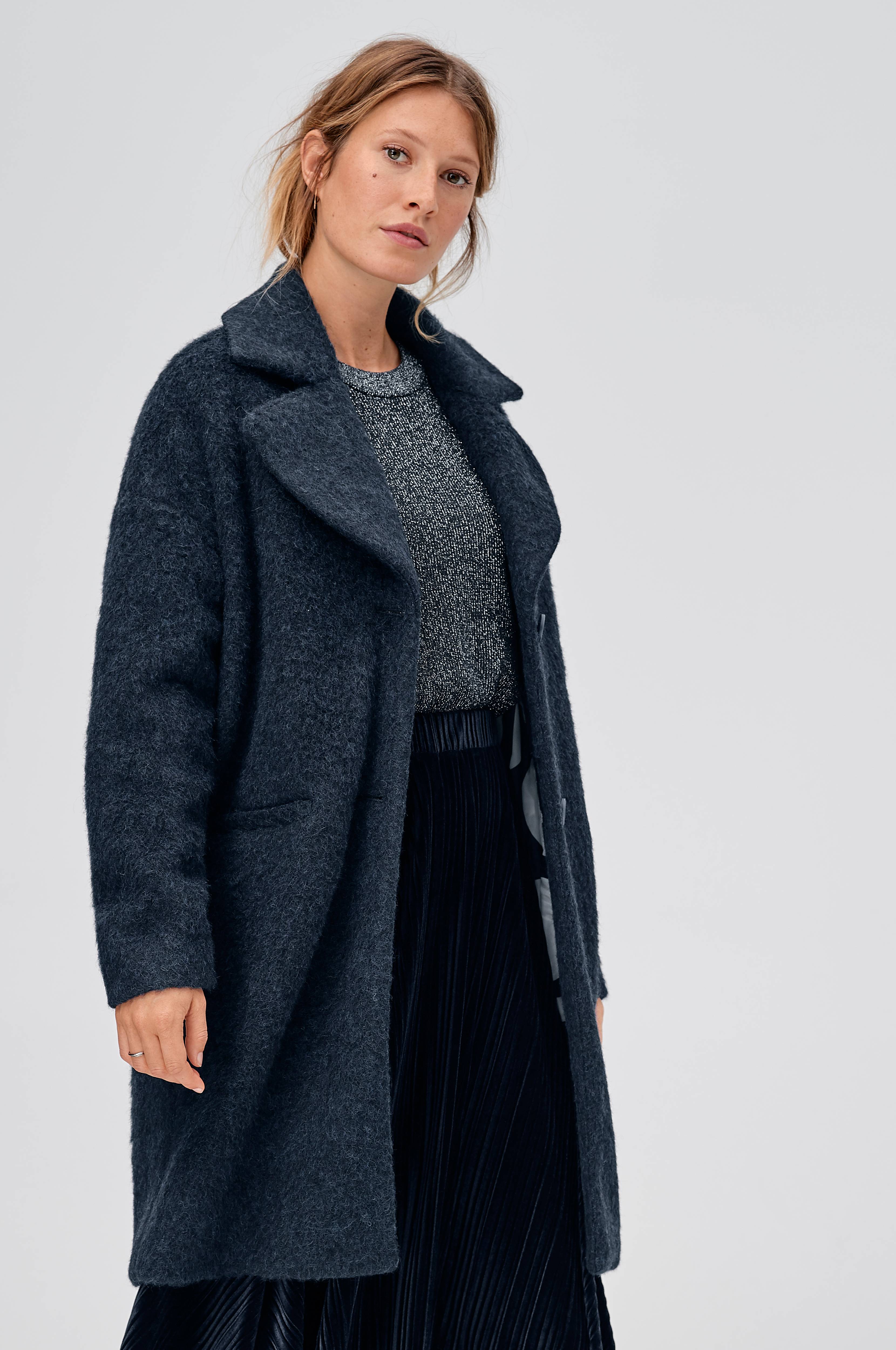 Oversize-mallinen Loni-takki, jossa iso kaulus ja kauluskäänteet. Edessä kaksi isoa nappia ja upotetut, reunustetut taskut. Karvapintaista villasekoitetta ja kuviollinen, kiiltävä vuori. Pituus takaa n. 97 cm koossa 36.
