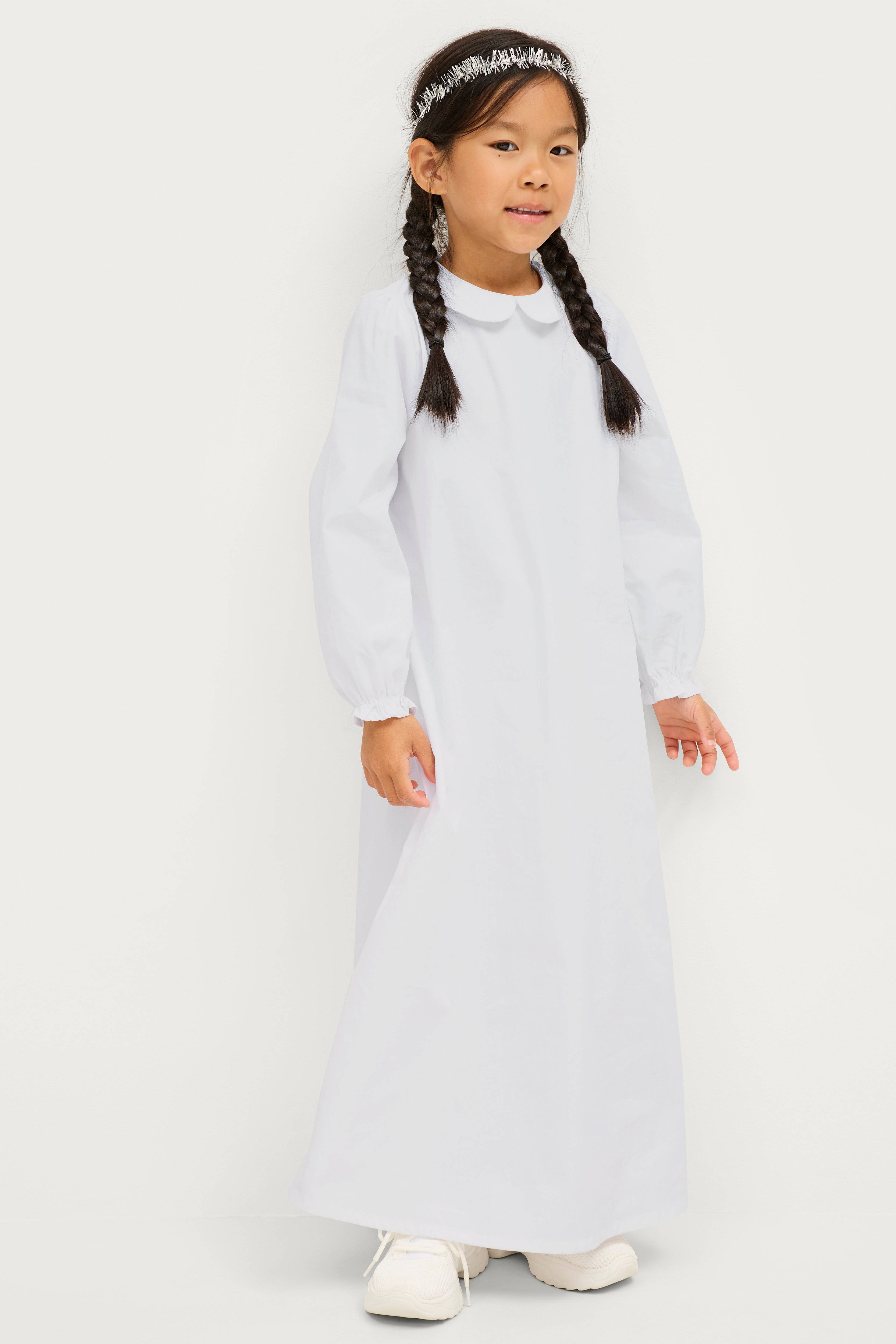 Lucia-mekko, jossa pyöreä kaulus. Napillinen halkio niskassa. Resori hihansuissa.