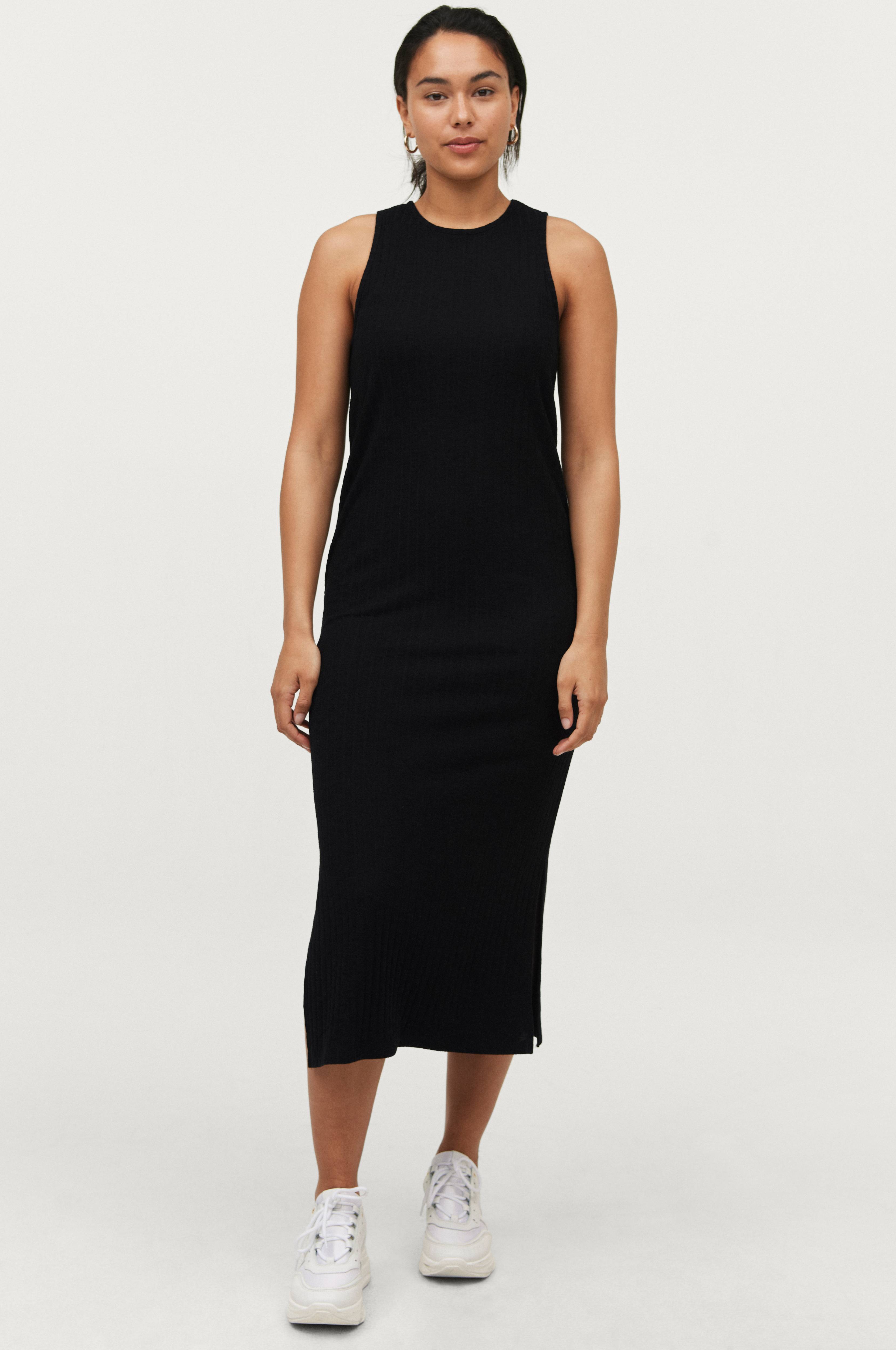 Hihaton pitkä mekko pehmeää ja leveävakoista joustinneulostrikoota. Kapea malli, helmassa sivuhalkiot. Pituus n. 131 cm koossa 34/36.