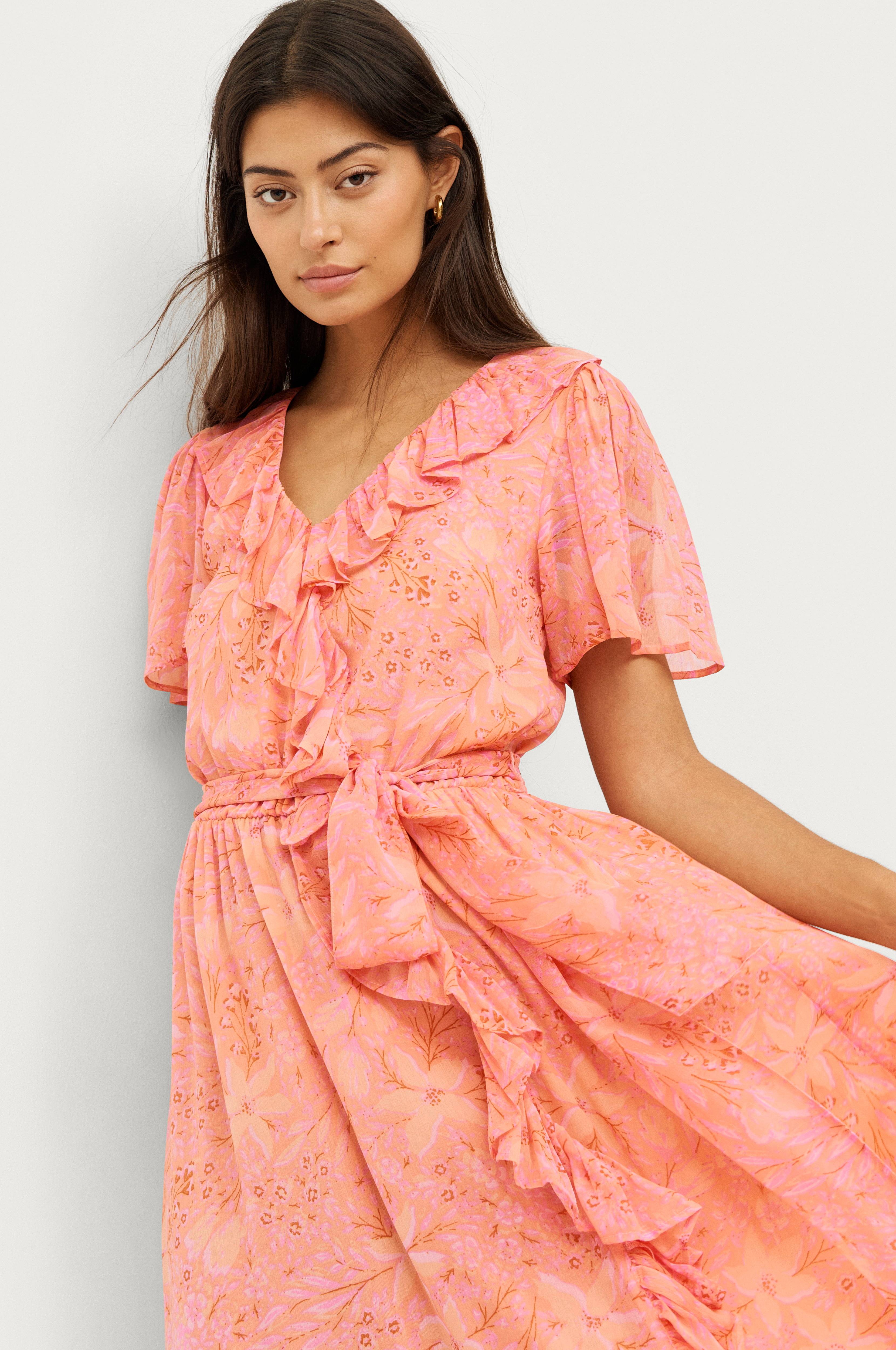Maksimekko hieman läpikuultavaa kangasta, jossa painettu kuvio. Kangasvuori. V-pääntie ja lyhyet perhoshihat. Päälleommeltu röyhelö pääntiessä ja edessä. Joustava poikkileikkaus ja irrotettava solmimisvyö vyötäröllä. Helmassa röyhelö, jossa poimutukset. Pituus n. 137 cm koossa 34/36.