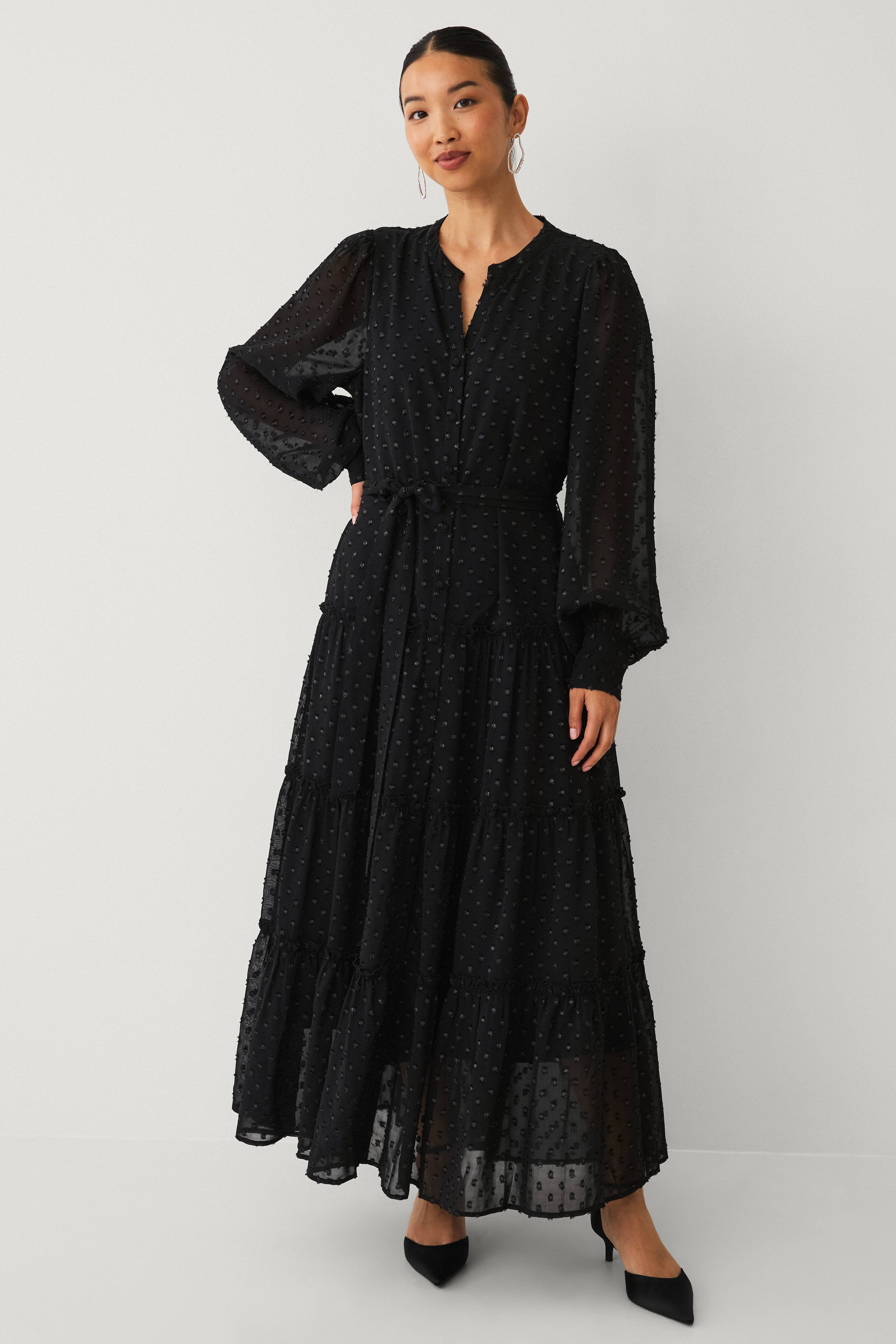 • Pitkä, kuviokudottu mekko sifongista• Päällystetyt, koristeelliset napit edessä• Pitkä, leveä bubble-hiha• Hihansuu kolmella napilla hihansuissa• Röyhelöt alhaalla• Nyöri vyölenkeillä vyötäröllä• Vuorattu• Pituus: 135 cm koossa S