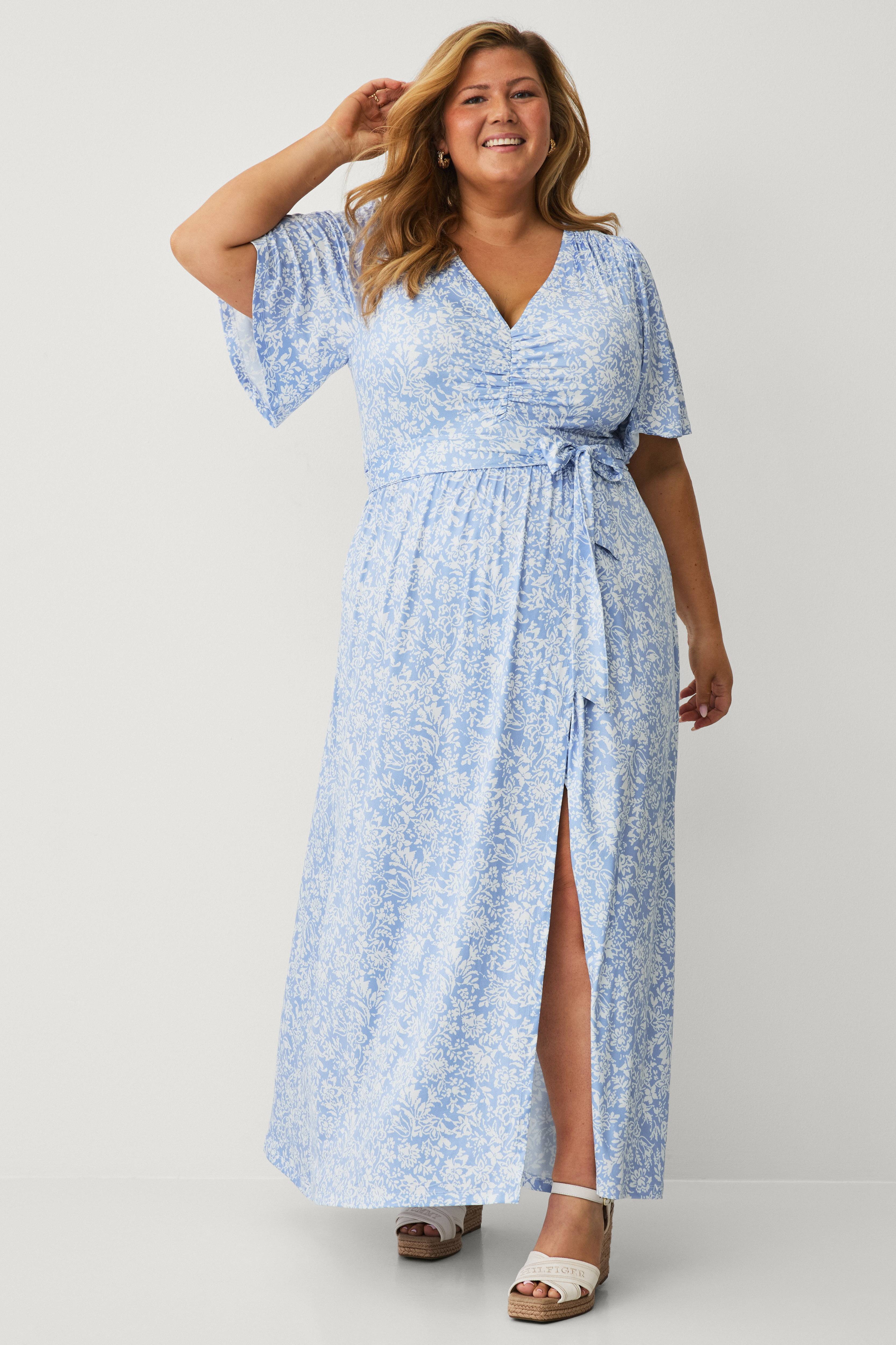 Pitkä mekko, joka ei ole liian pitkä lyhyelle ihmiselle, mutta isompi malli 🥰 Pehmeä ja mukava kangas, halkio näkyy vain jos haluaa, joten ei näytä kaikkea tahatonta kauneutta 😂