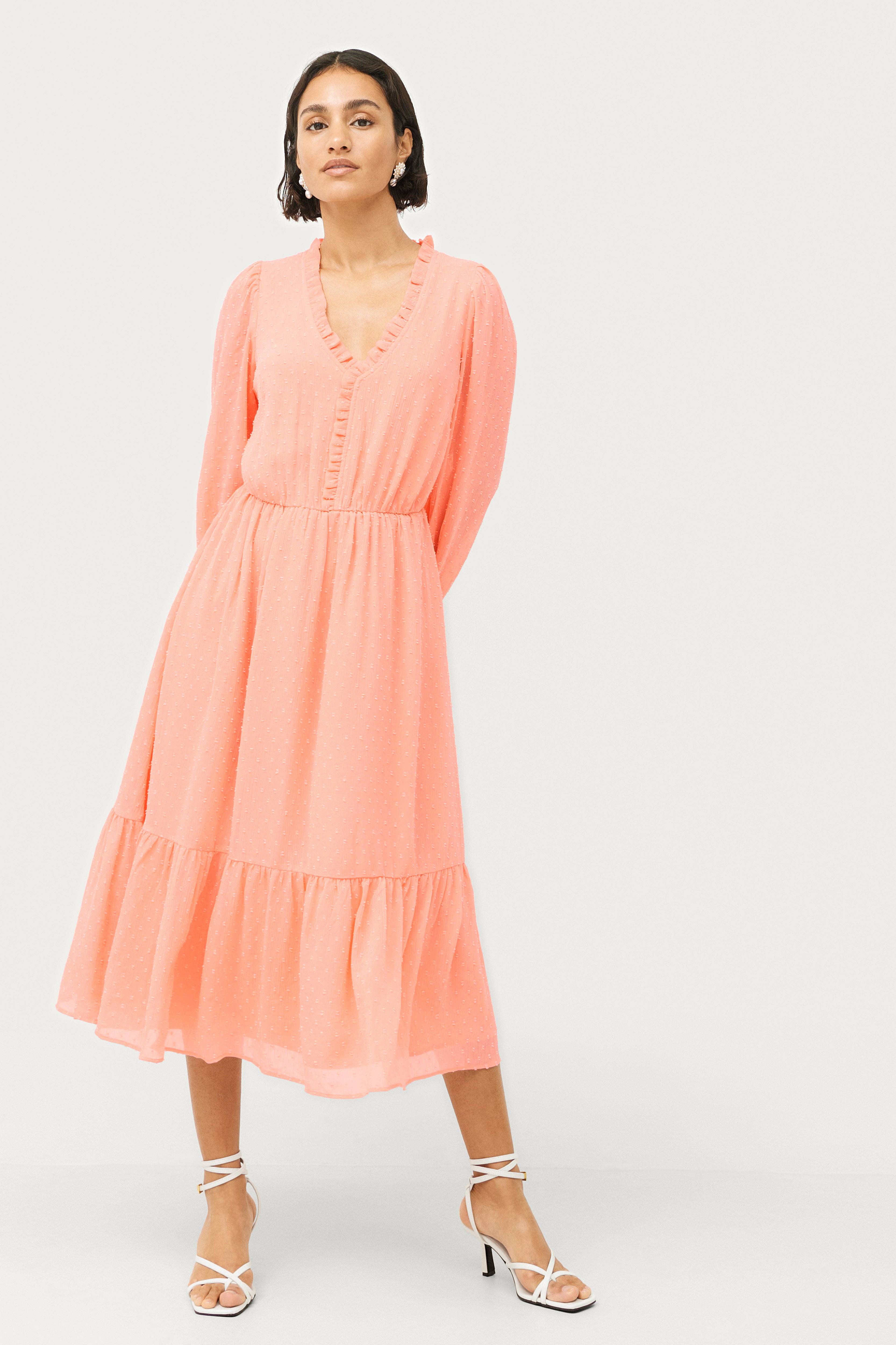 Ostettu hääjuhliin, sai niin paljon mukavia kommentteja mekosta. Ihana väri, koralli vaaleanpunainen ja kesäinen. Joustava rinnan alla ja neulo hihoissa, jotka antoivat mukavaa nukkaa. Ih…