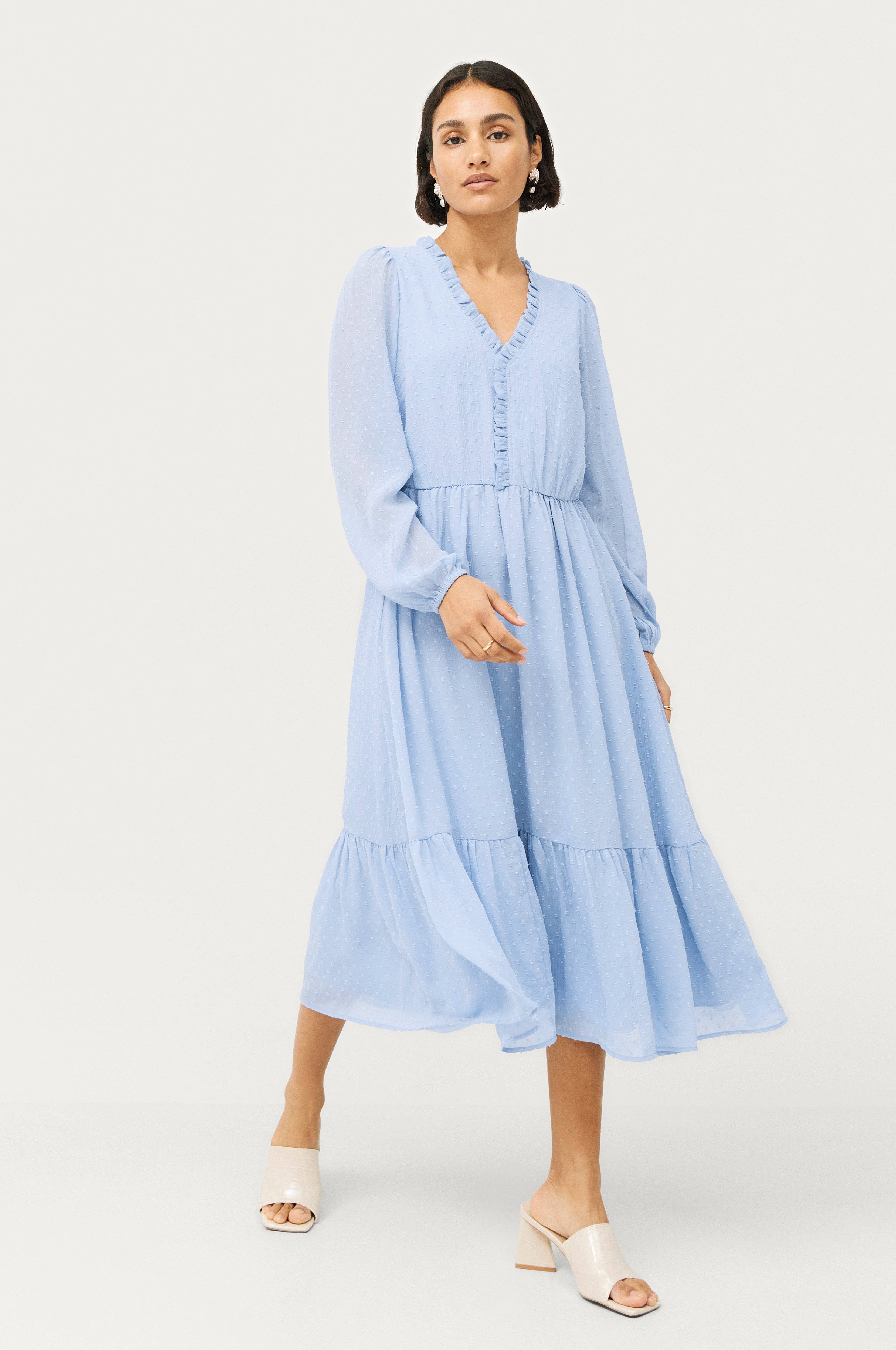 Vuorillinen mekko hieman läpikuultavaa materiaalia, jossa aavistuksen raidallinen pinta ja struktuuripilkkuja. V-pääntie, jossa röyhelöreuna. Vuorittomat hihat, hihansuissa kuminauha. Kuminauha vyötäröllä ja röyhelö helmassa. Kangasvuori. Pituus n. 119 cm koossa 34/36.