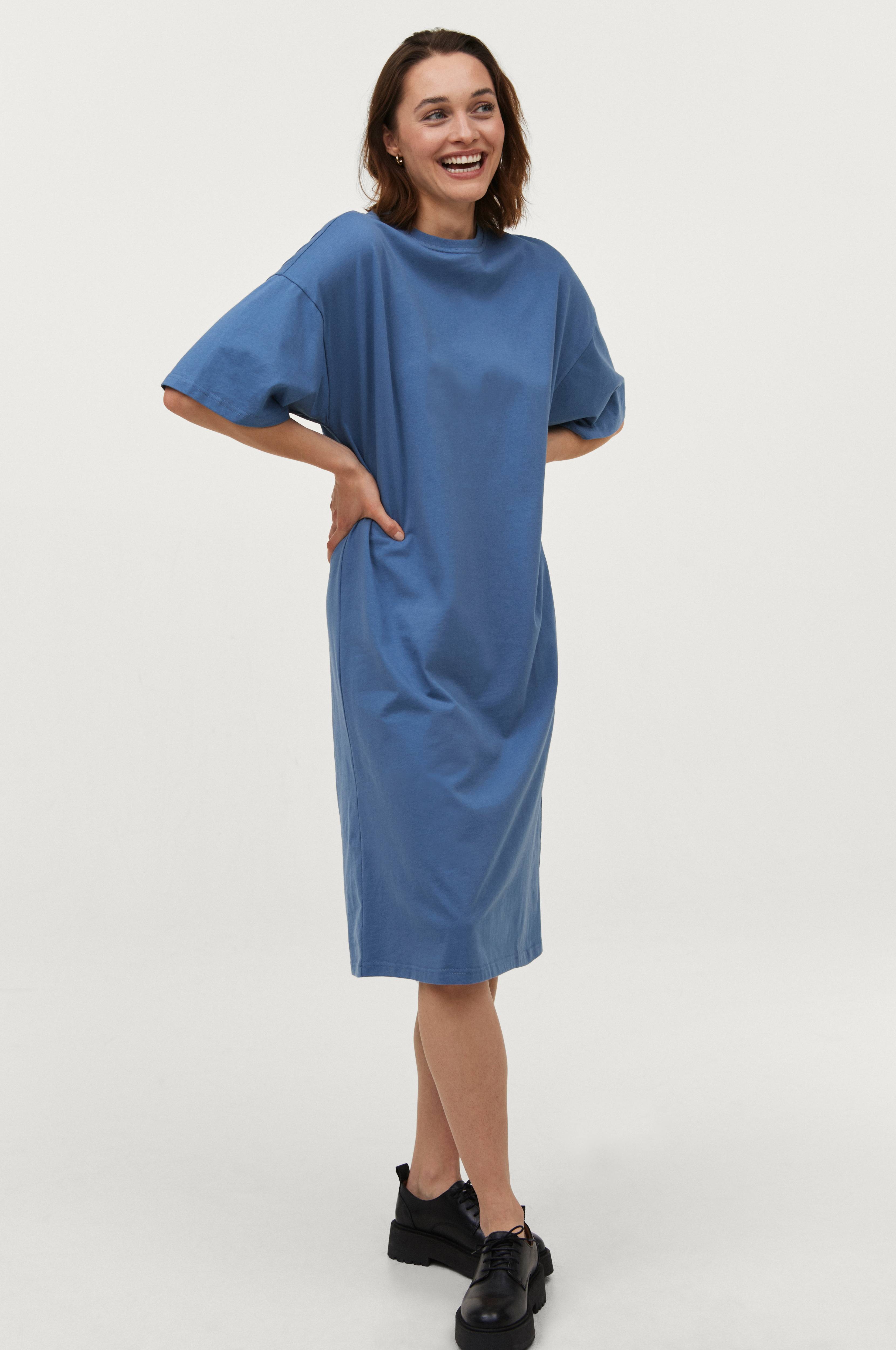 T-paitamekko puuvillatrikoota. Suora malli, jossa väljät lyhyet hihat ja madalletut olkapäät. Pyöreä joustinneulospääntie. Pituus n. 114 cm koossa 34/36.