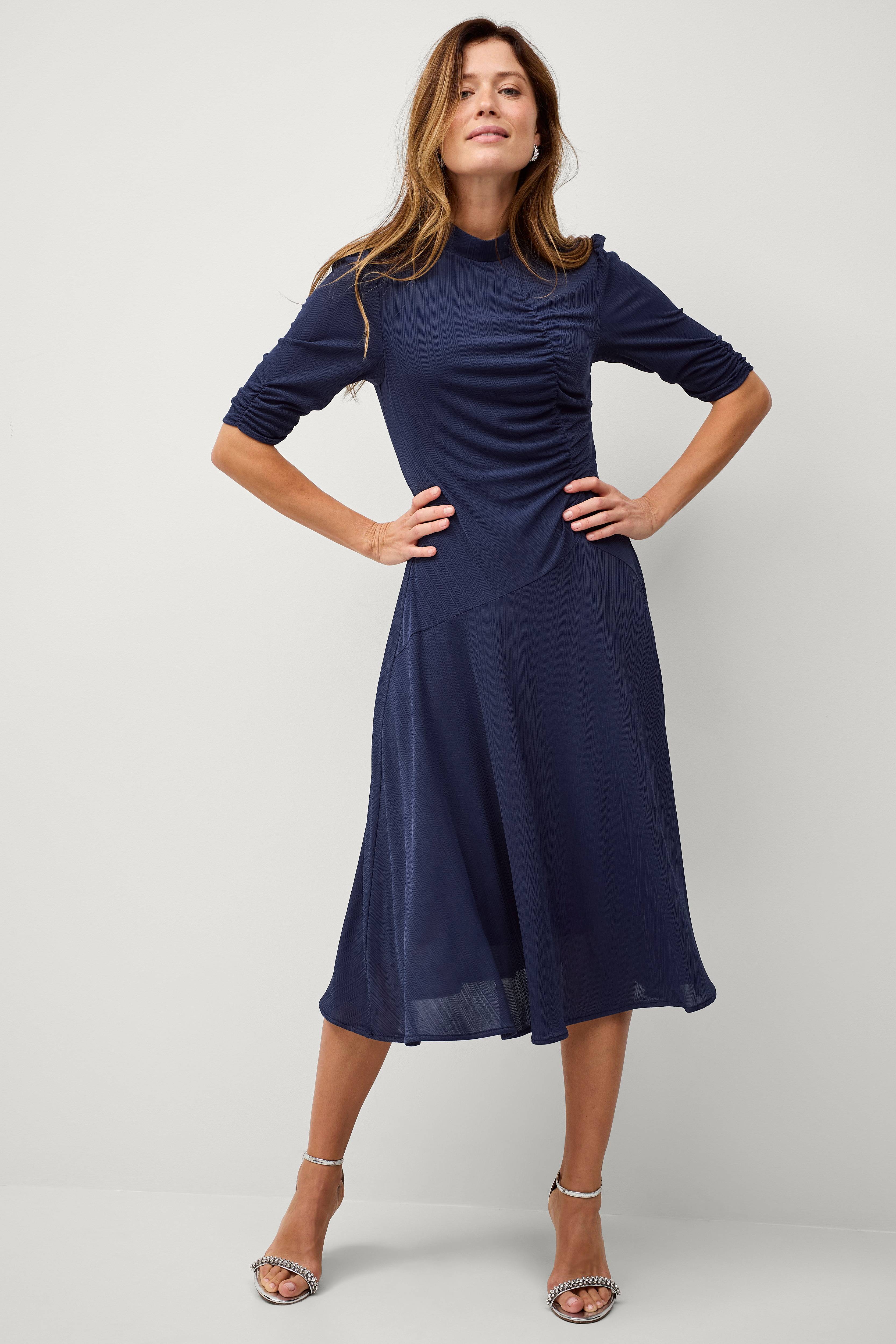 • Tyköistuva malli• Puolikorkea kaulus vetoketjulla selässä• Lyhyt, poimutettu bubble-hiha• Elastinen drapeeraus edessä• Leveä hame• Vuorattu• Pituus: 120 cm koossa 36
