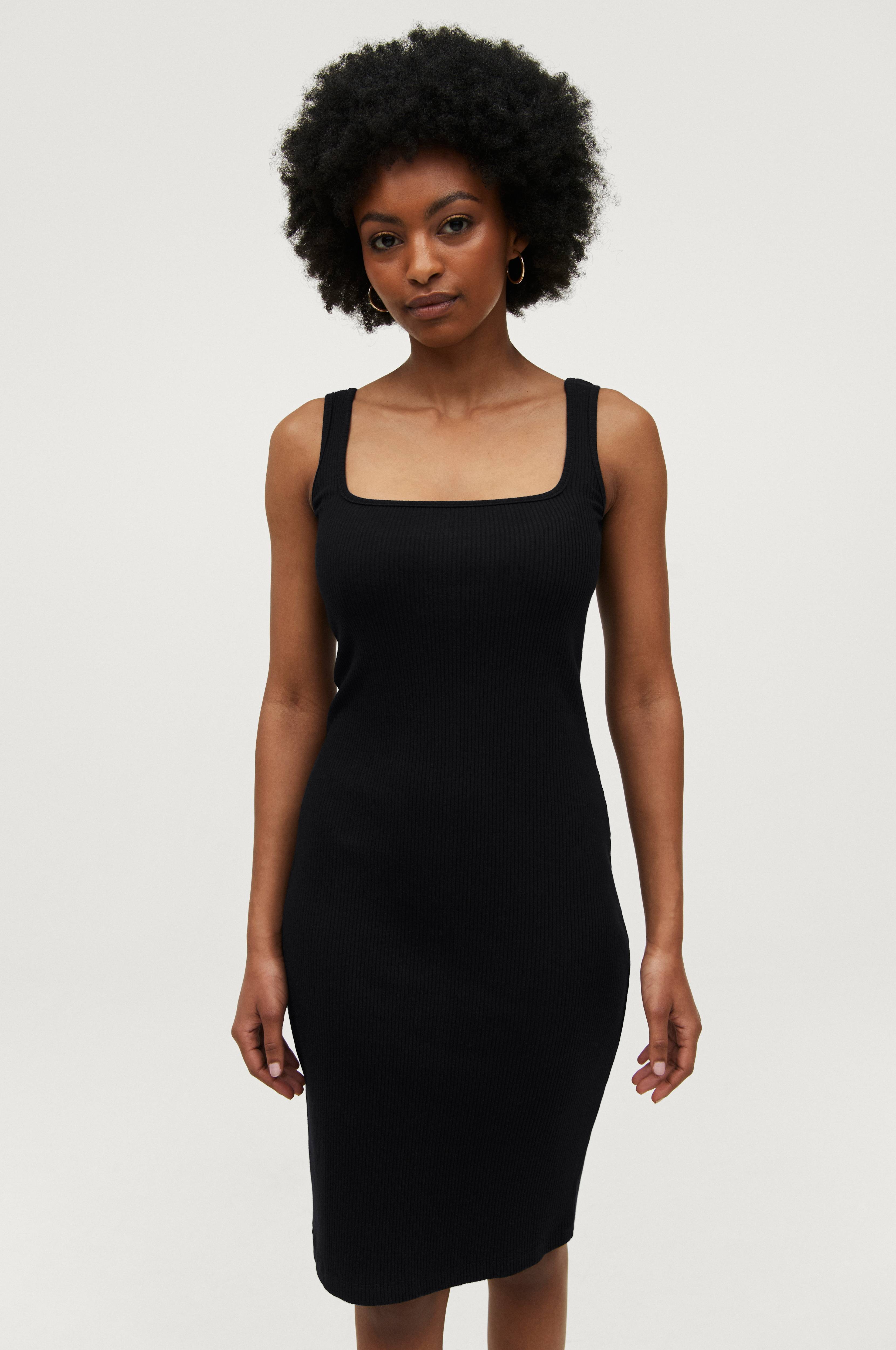 Vartalonmyötäinen mekko joustinneulospuuvillatrikoota. Hihaton malli ja nelikulmainen pääntie. Pituus n. 95 cm koossa 34/36.