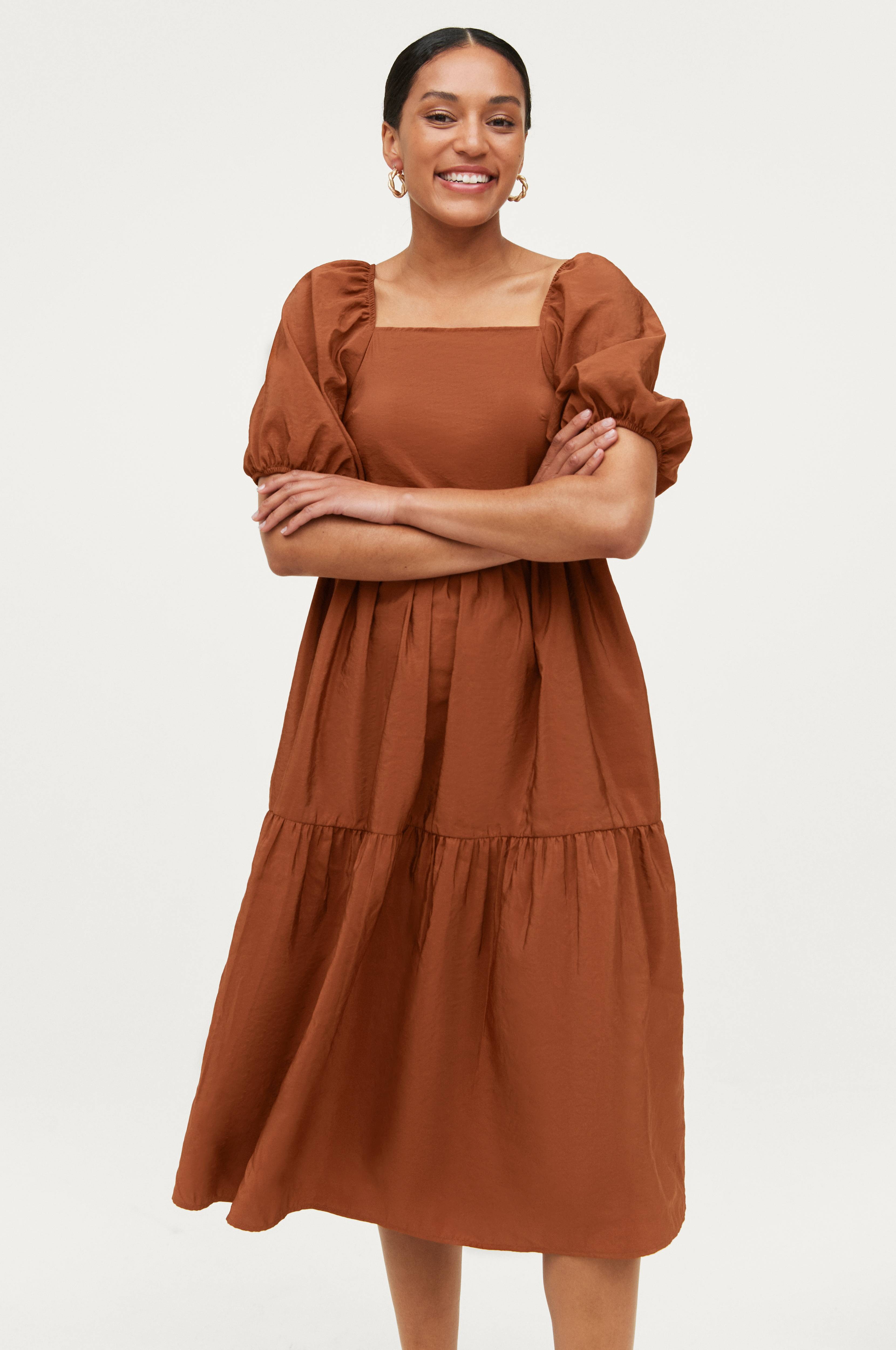 Vartalonmyötäinen mekko kiiltävää satiinia. Suoraan leikattu pääntie ja selkä, jossa solmittavat nauhat niskassa ja upotettu kuminauha takana sekä olkapäillä. Lyhyet puhvihihat, joissa upotettu kuminauha hihansuissa. Vyötäröllä poikkileikkaus ja poimutus. Leveässä hameosassa leveä röyhelö helmassa. Pituus n. 112 cm koossa 34/36.