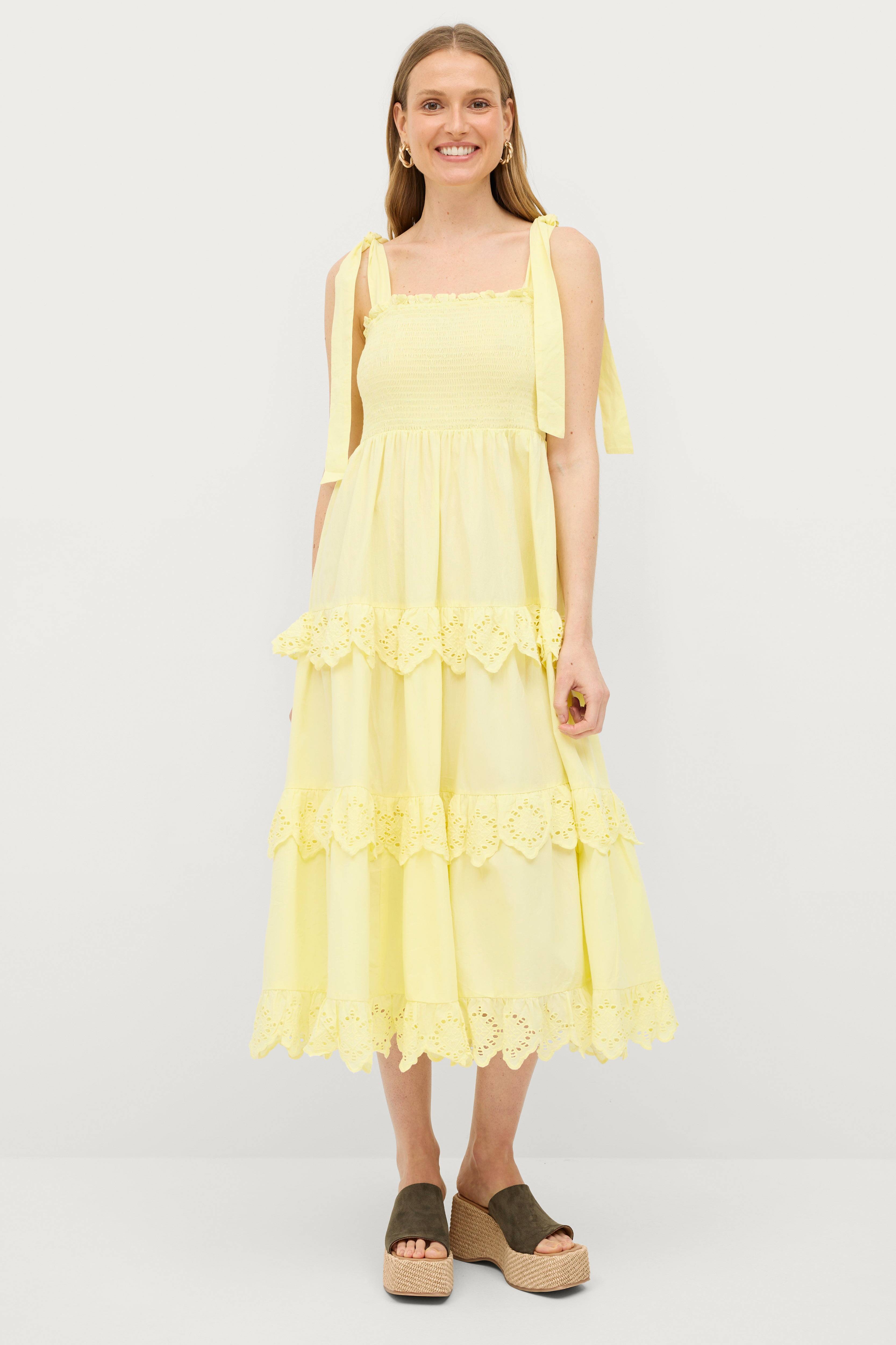 Hihaton mekko, jossa smokkirypytys yläosassa ja pieni röyhelö yläreunassa. Leveät solmittavat olkaimet. Hameessa reikäkirjaillut röyhelöt. Pituus n. 102 cm koossa 34/36.