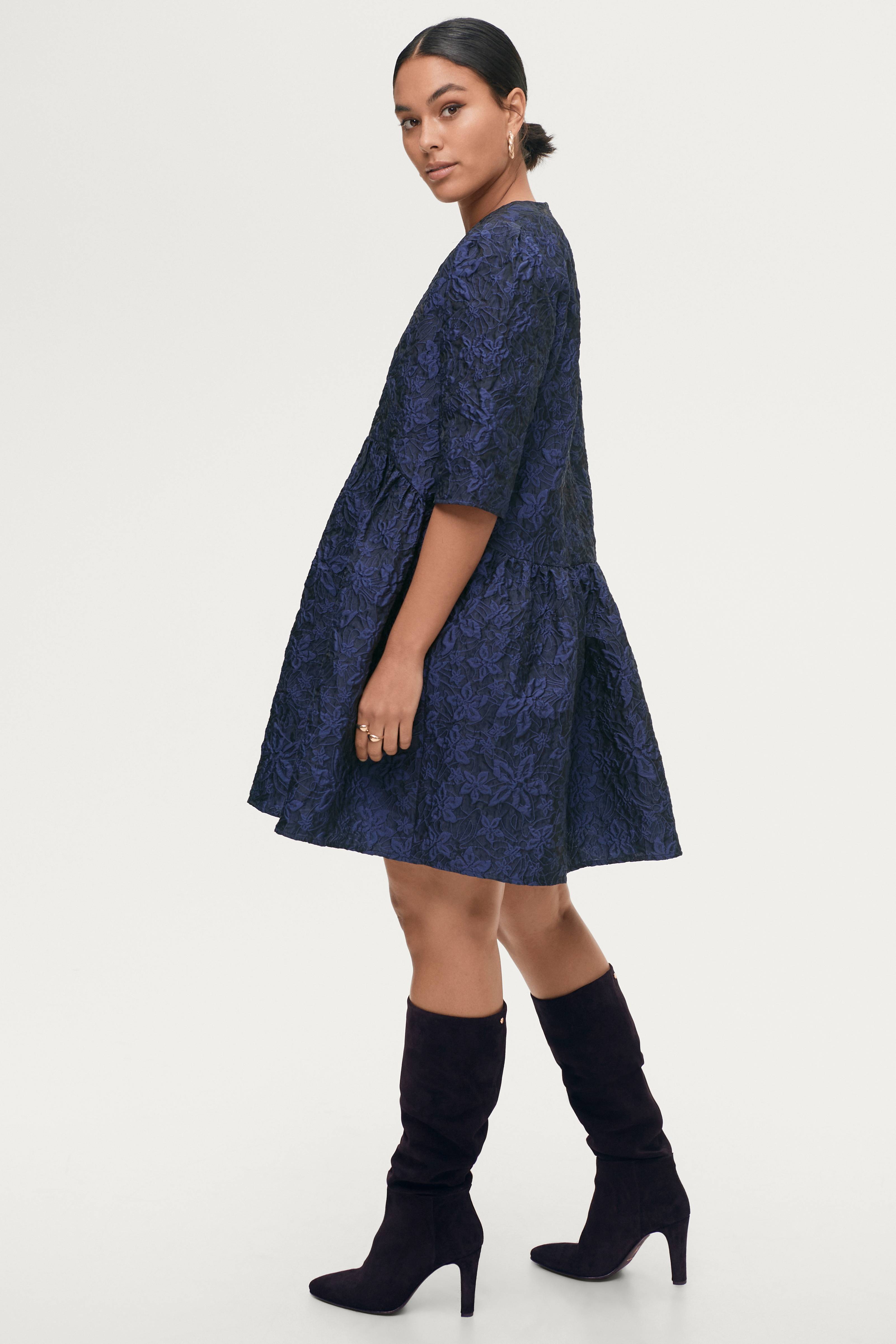 Tori-mekko jakardikuosista materiaalia. Pyöristetty poikkileikkaus edessä ja suoraan leikattu takana sekä erittäin leveä hameosa. Puolipitkät puhvihihat, joissa ommellut laskokset olkapäillä. Pyöreä pääntie, jossa piilovetoketju selässä. Pituus n. 94 cm koossa 34/36.