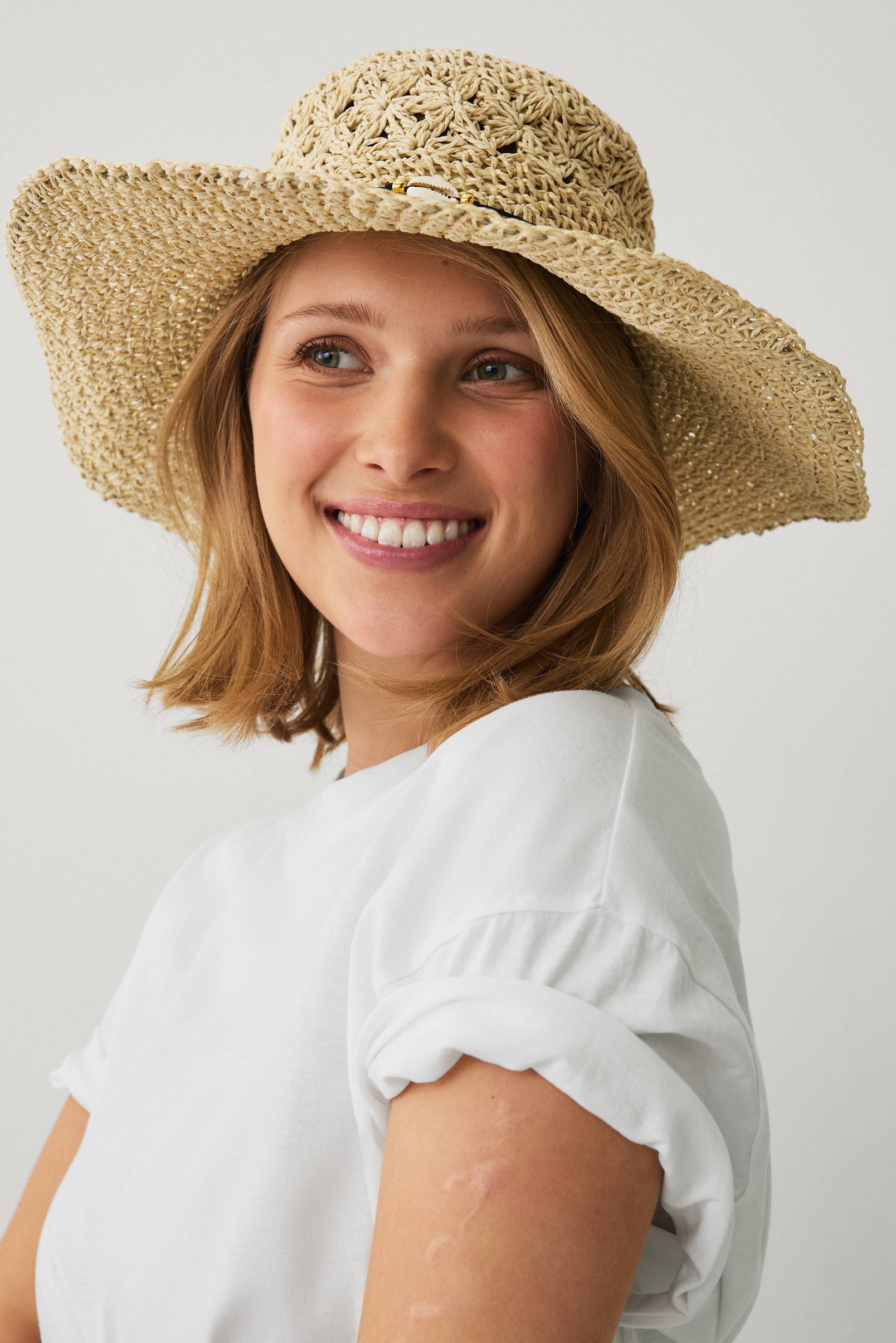 • Virkattu olkihattu• Koristeellinen hihna simpukalla ja helmillä• Sisäinen, säädettävä kiristysnyöri• Muotoiltava ulkoreuna• Levyn leveys: 10 cm