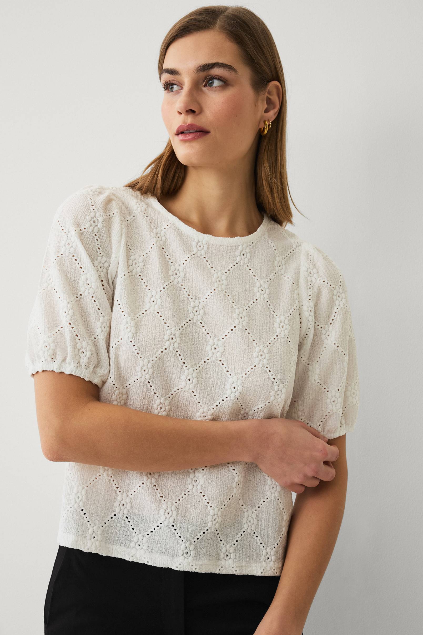 • Toppi kukkakuvioisesta, puoliksi läpinäkyvästä, ohuesta materiaalista koristeellisilla aukoilla lyhyellä pallohihalla kuminauhalla hihansuissa