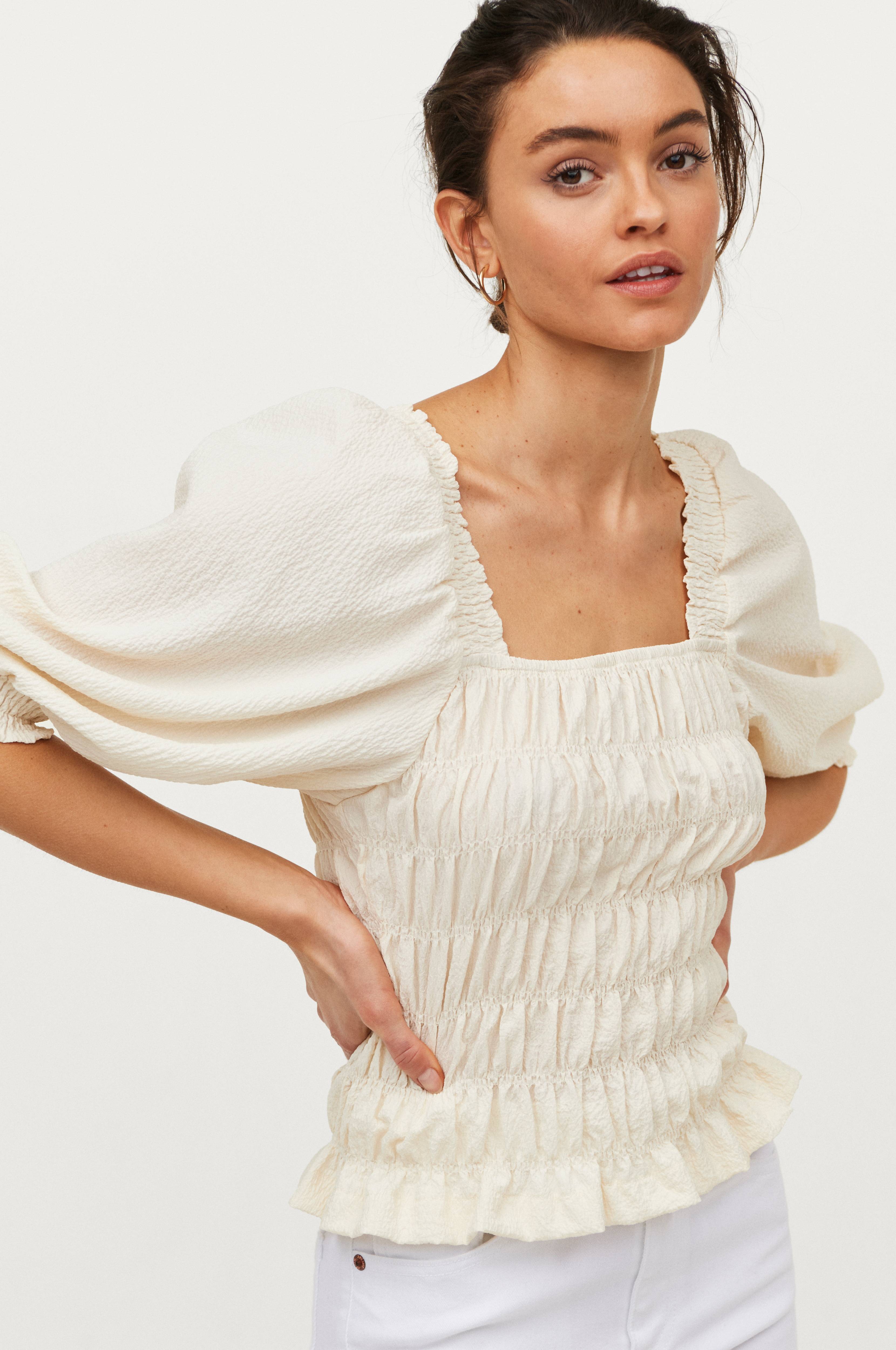 Miellyttävän joustava smokkirypytys edessä ja takana. Kulmikas pääntie, 3/4-pituiset pussihihat ja smokkirypytys hihansuissa. Pituus n. 52 cm koossa 34/36.