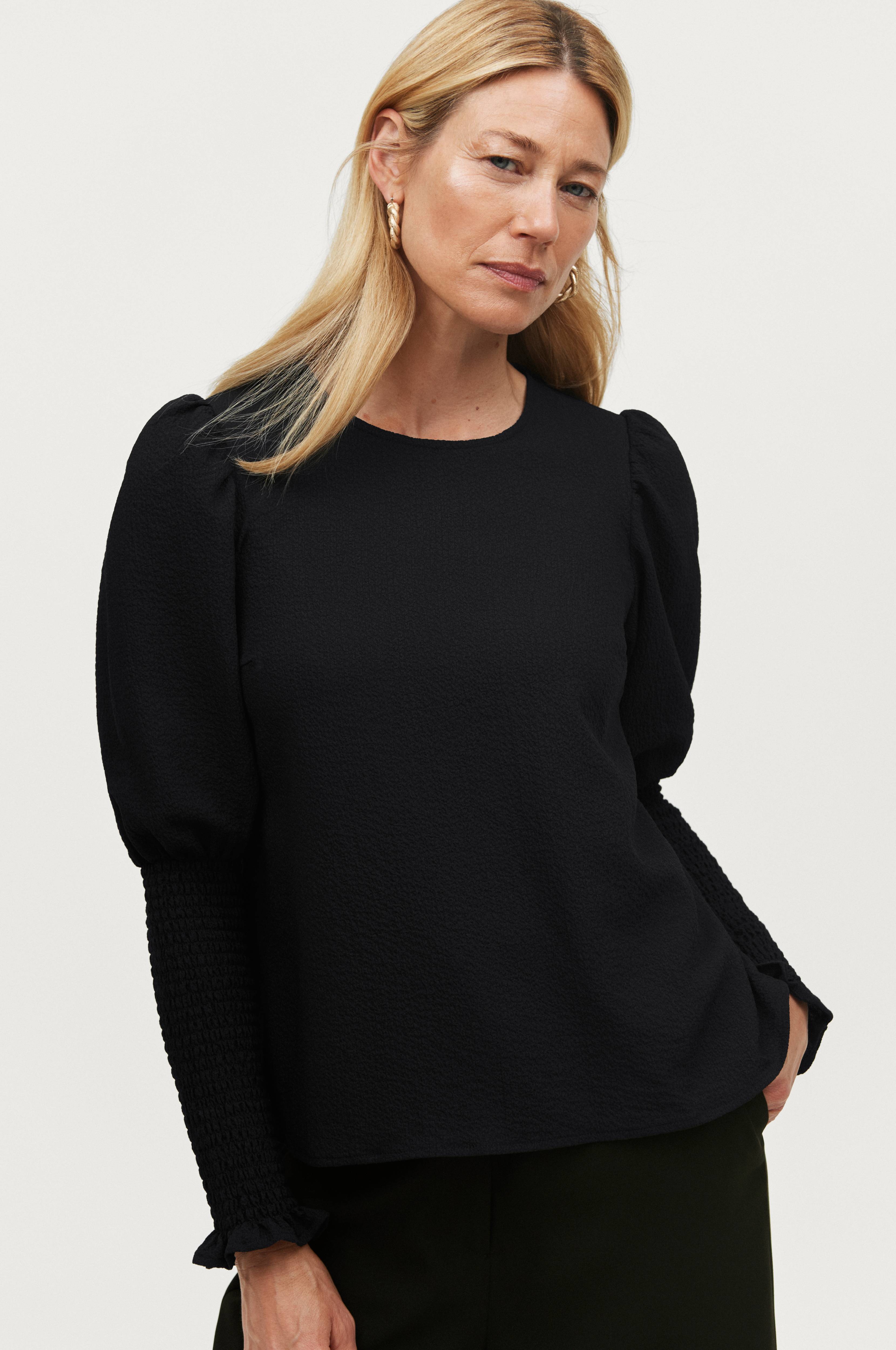 Paita, jossa pitkät puhvihihat. Hihoissa väljä yläosa, kapea alaosa smokkirypytystä ja röyhelö hihansuissa. Pyöreä pääntie, jossa halkio ja nappi takana. Kreppimateriaalia. Pituus n. 61 cm koossa 34/36.