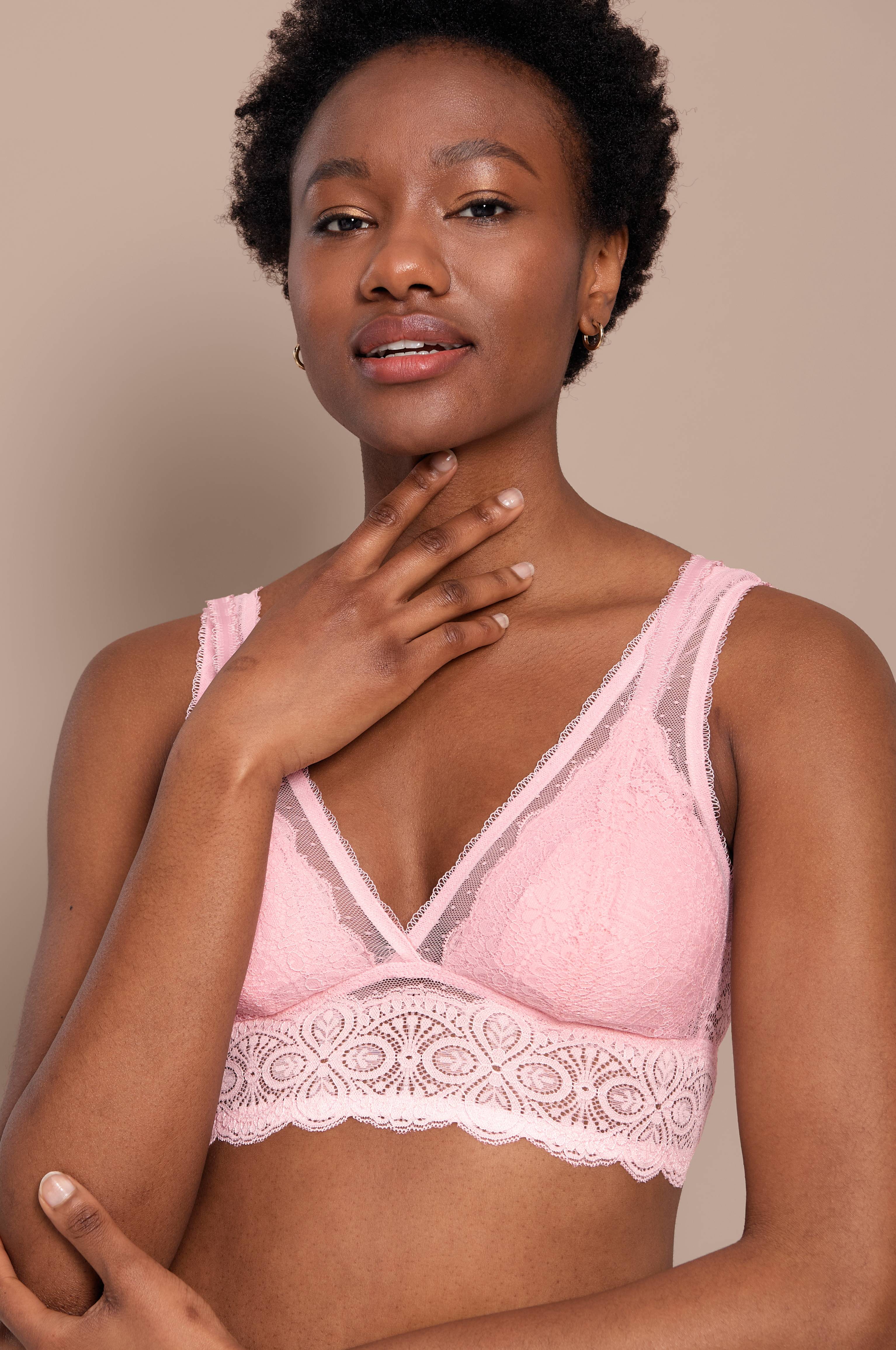 Pehmeät bralette-rintaliivit, joissa irrotettava toppaus kupeissa ja leveä reuna alhaalla. Pitsiä ja verkkokangasta. Kaksinkertaiset olkaimet, joita ei voi säätää. Leveä hakaskiinnitys selässä.
