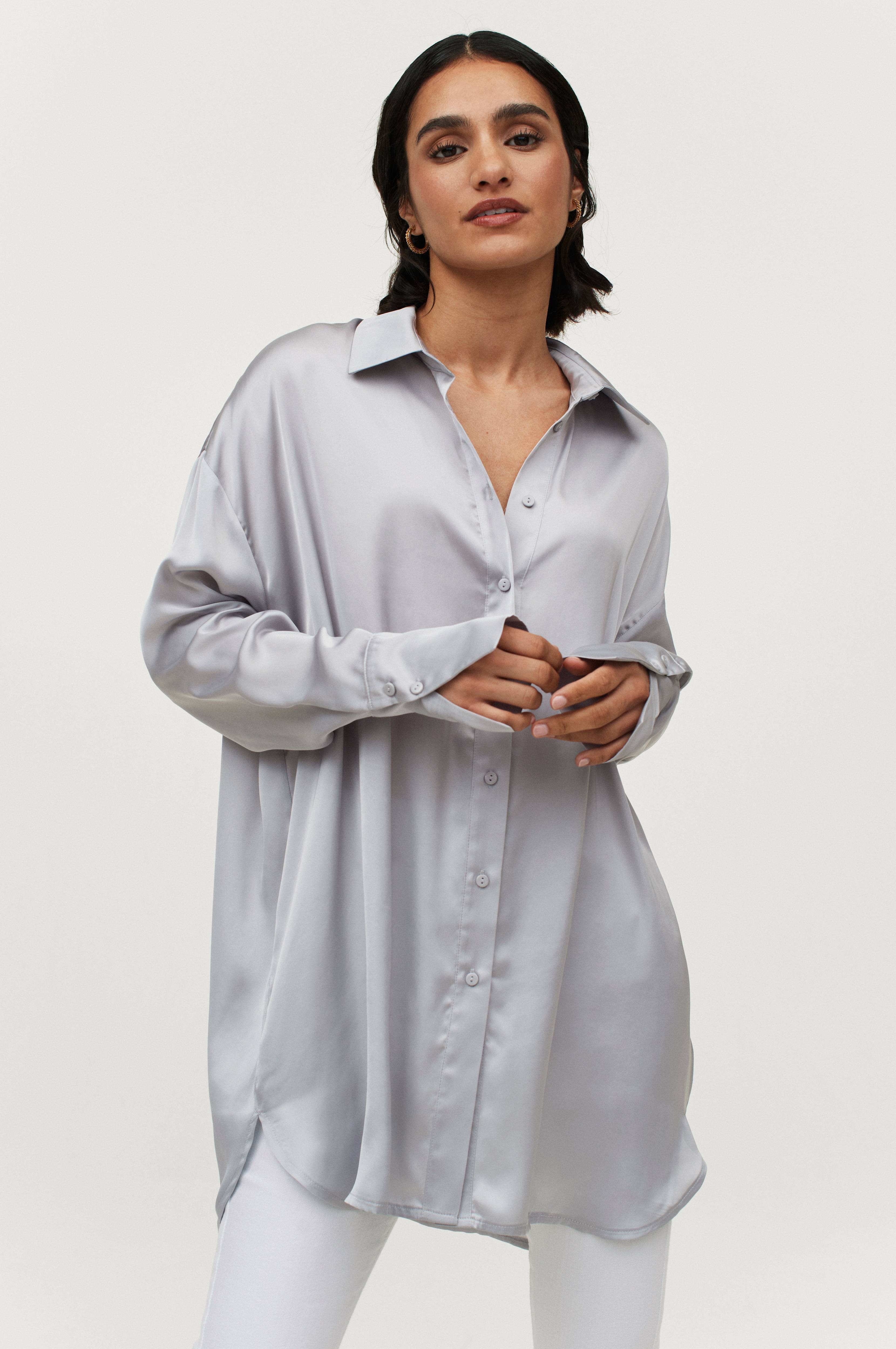 Suora oversize-malli satiinia. Pieni kaulus ja edessä kokopitkä napitus. Pitkät hihat, joissa leveä kalvosin hihansuissa. Helmassa pyöristetyt sivuhalkiot. Pituus n. 81 cm koossa 34/36.