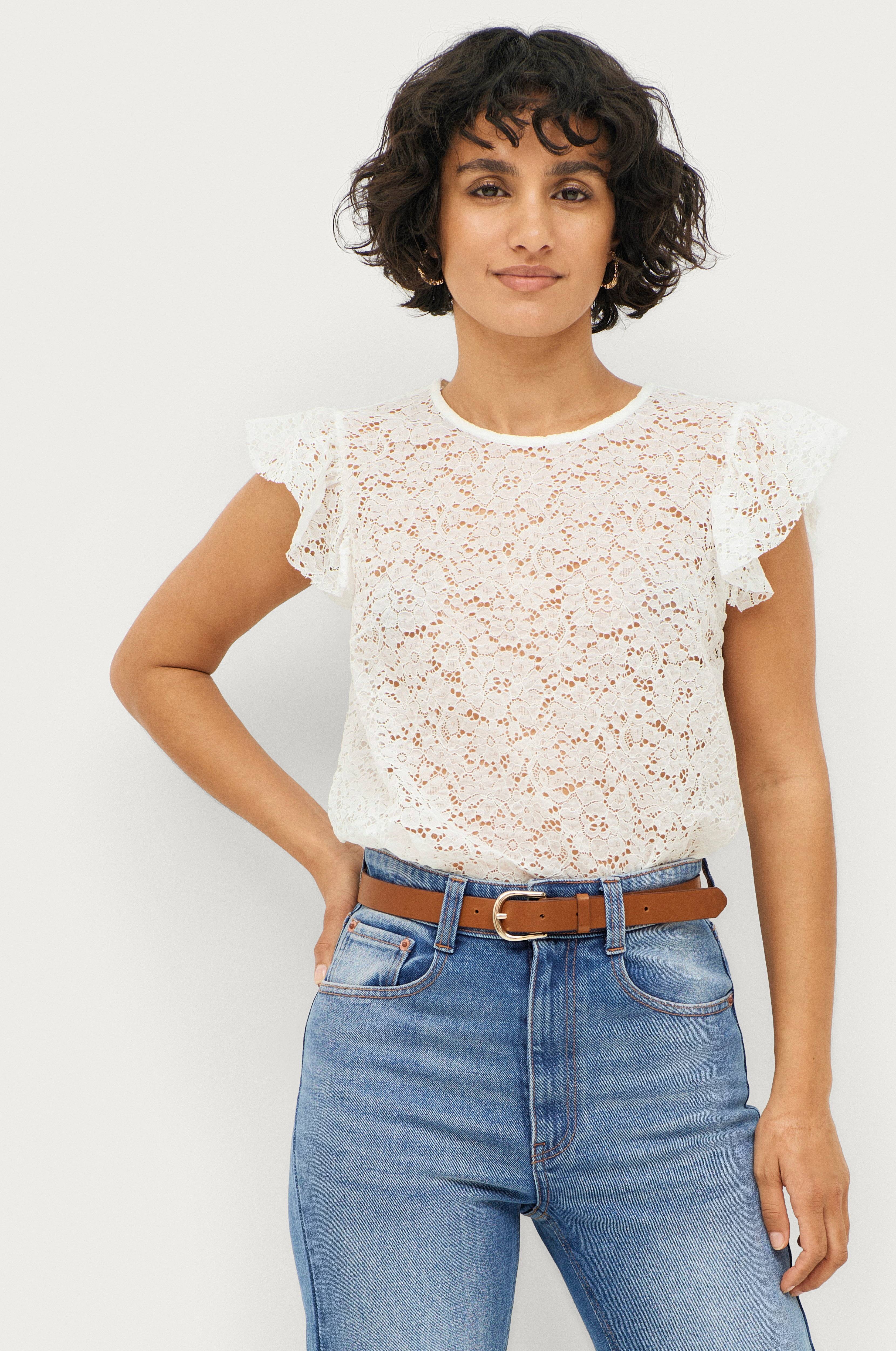 Tyylikäs ohut pitsitoppi valkoisena. Hyödyllinen hyvin erilaisissa yhteyksissä, vaatii rintaliivit alla.