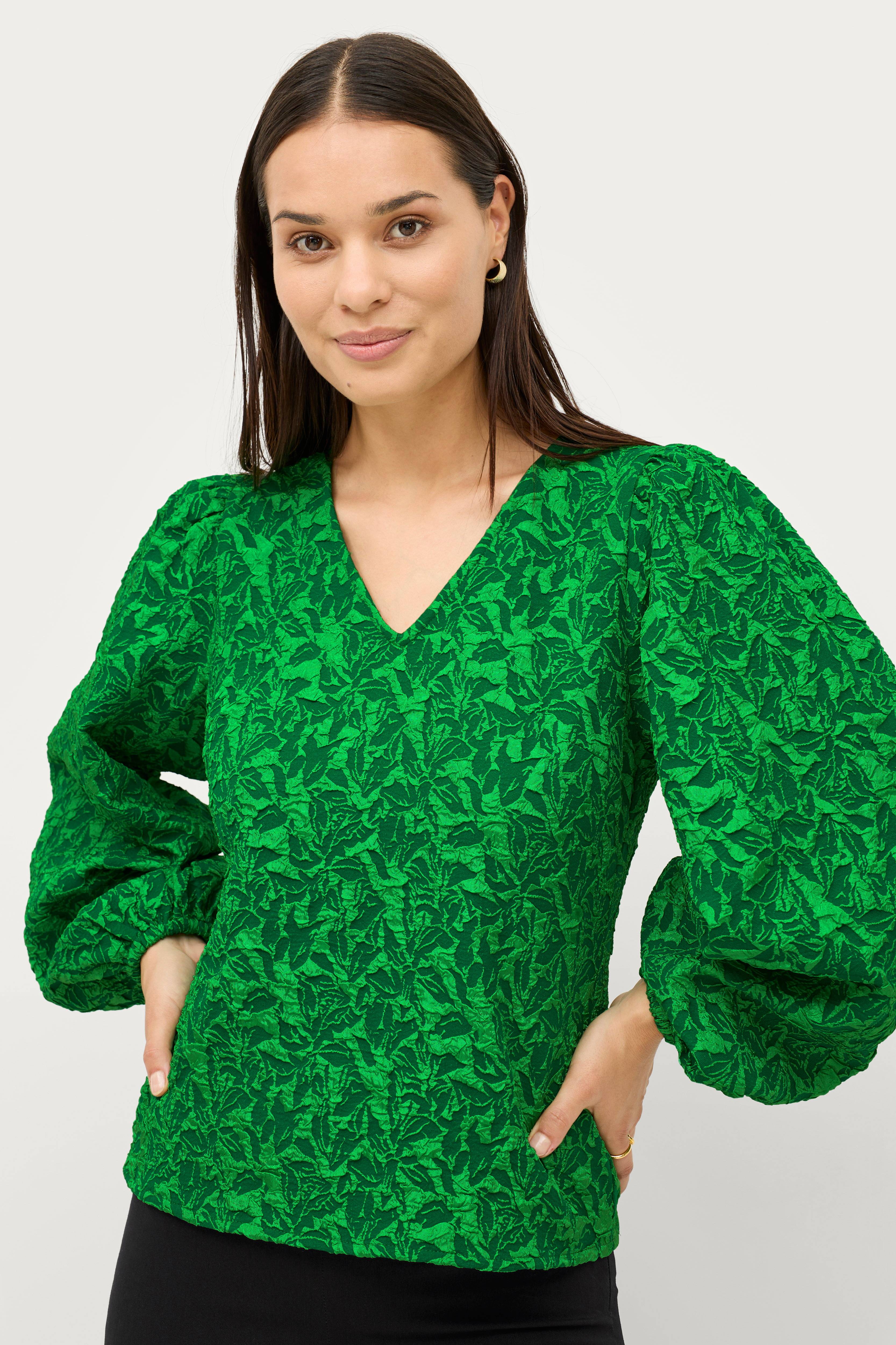 Uskomattoman kaunis pusero, jossa on suuret puhvihihat ja vahva kangas, näyttää tyylikkäältä tiukkoihin housuihin tunkettuna.