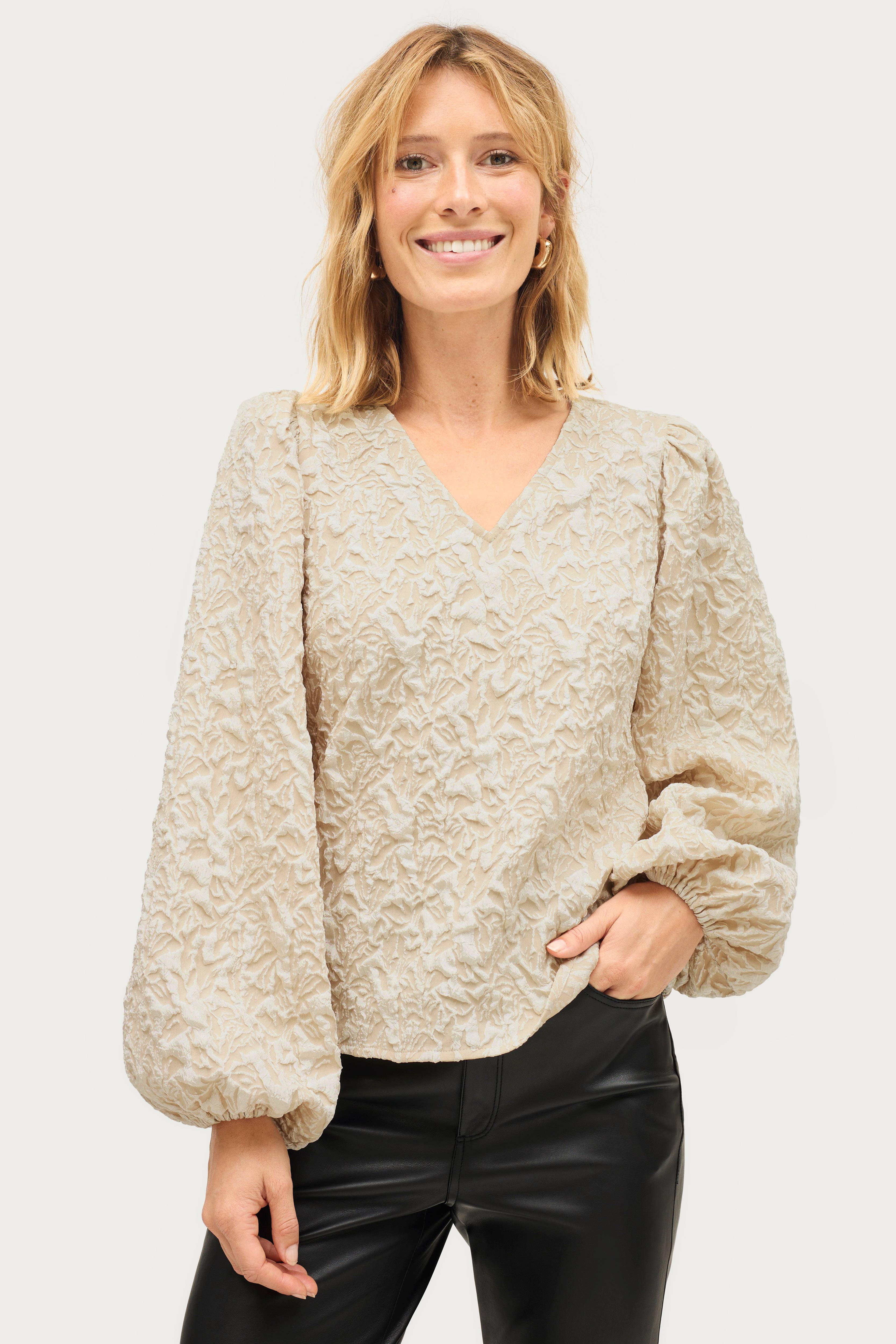 Uskomattoman kaunis pusero, jossa on suuret puhvihihat ja vahva kangas, näyttää tyylikkäältä tiukkoihin housuihin tunkettuna.