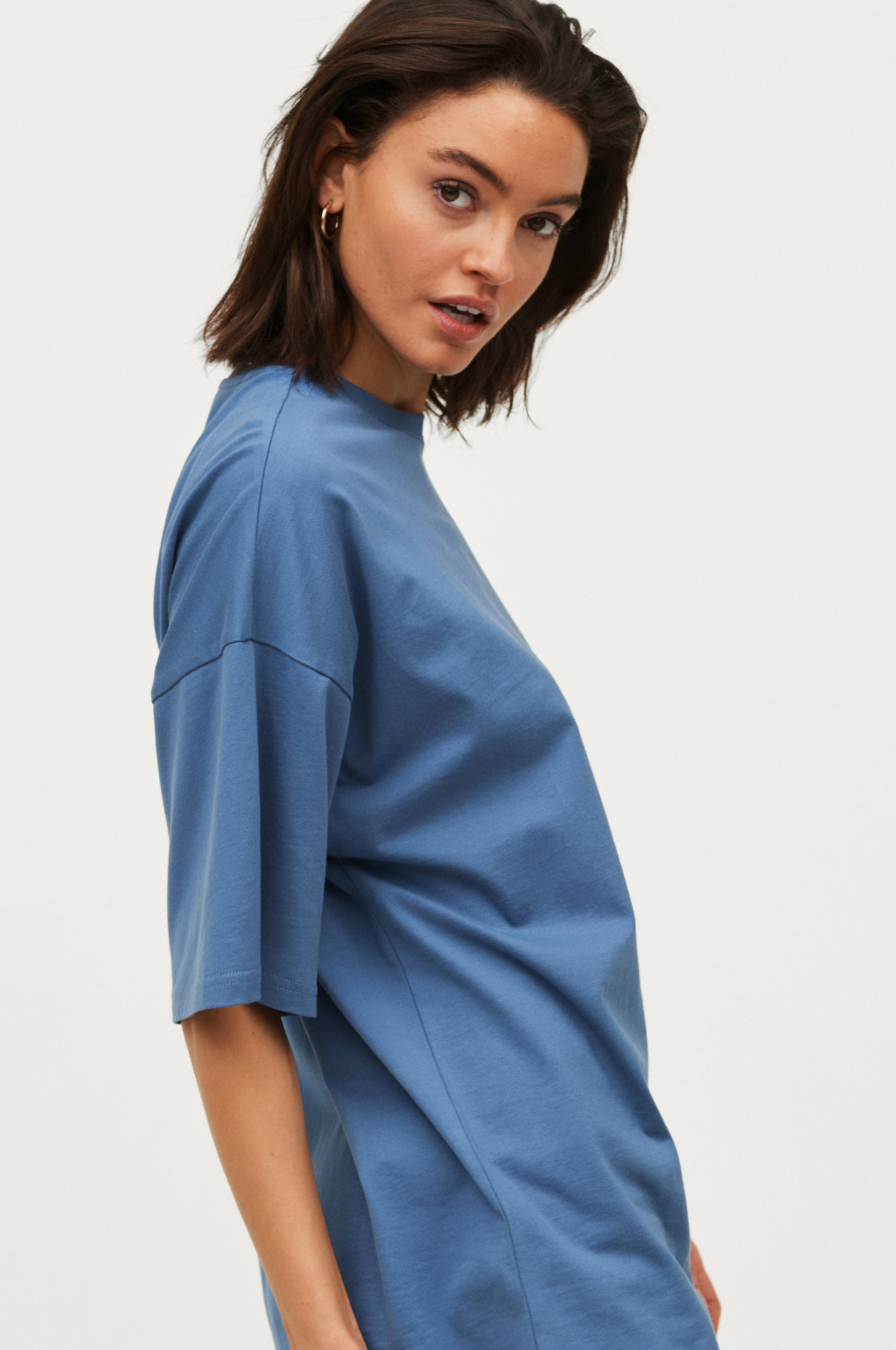 Oversize-mallinen pusero, jossa pyöreä pääntie, lyhyet hihat ja madalletut olkapäät. Paksua puuvillatrikoota. Pituus n. 74 cm koossa 34/36.