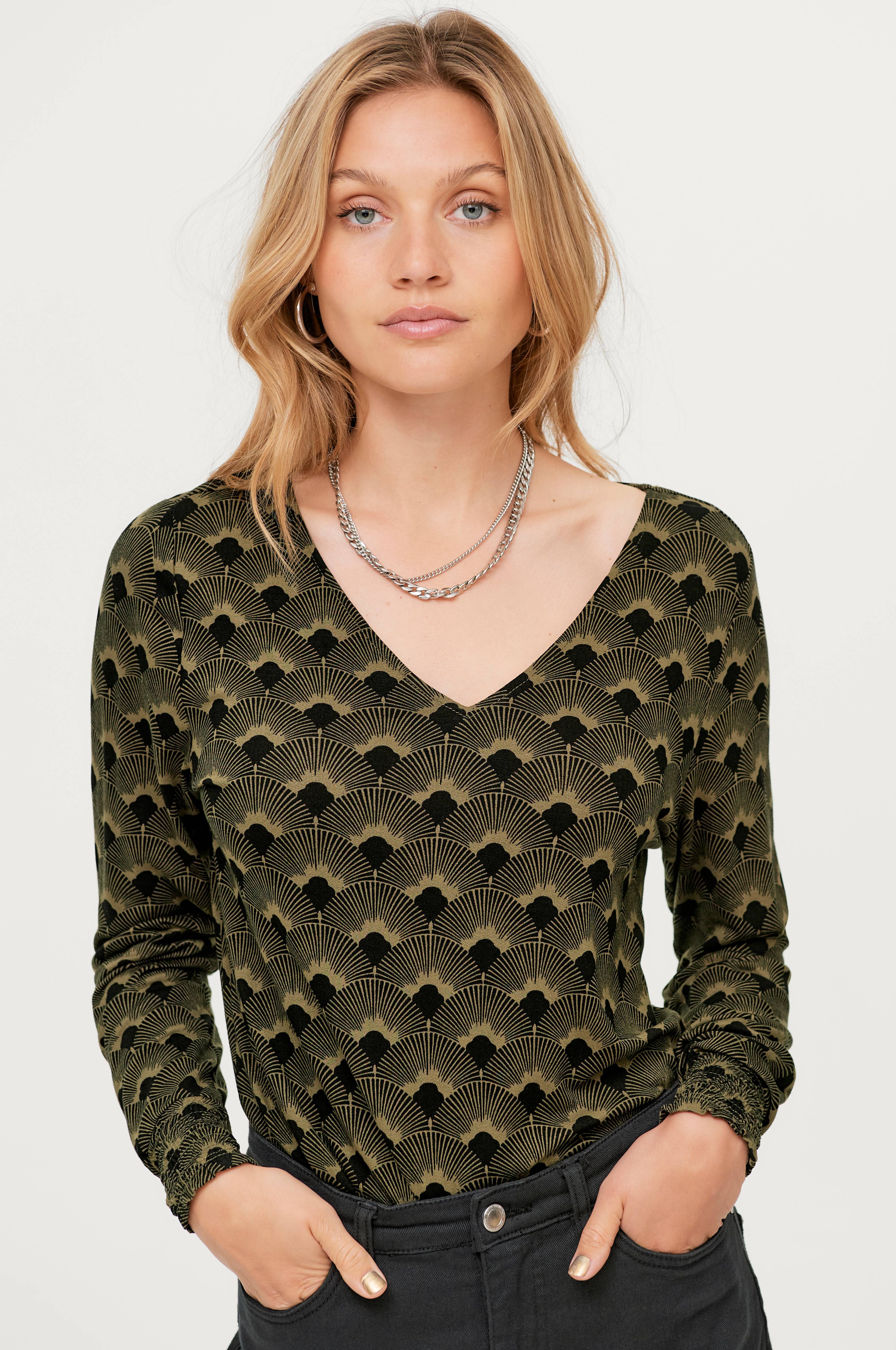 Ida-pusero kaunista kuviollista viskoositrikoota. Pitkähihainen malli, jossa smokkirypytys hihansuissa. V-pääntie edessä ja kevyesti pyöristetty helma. Pituus n. 72 cm koossa 34/36.