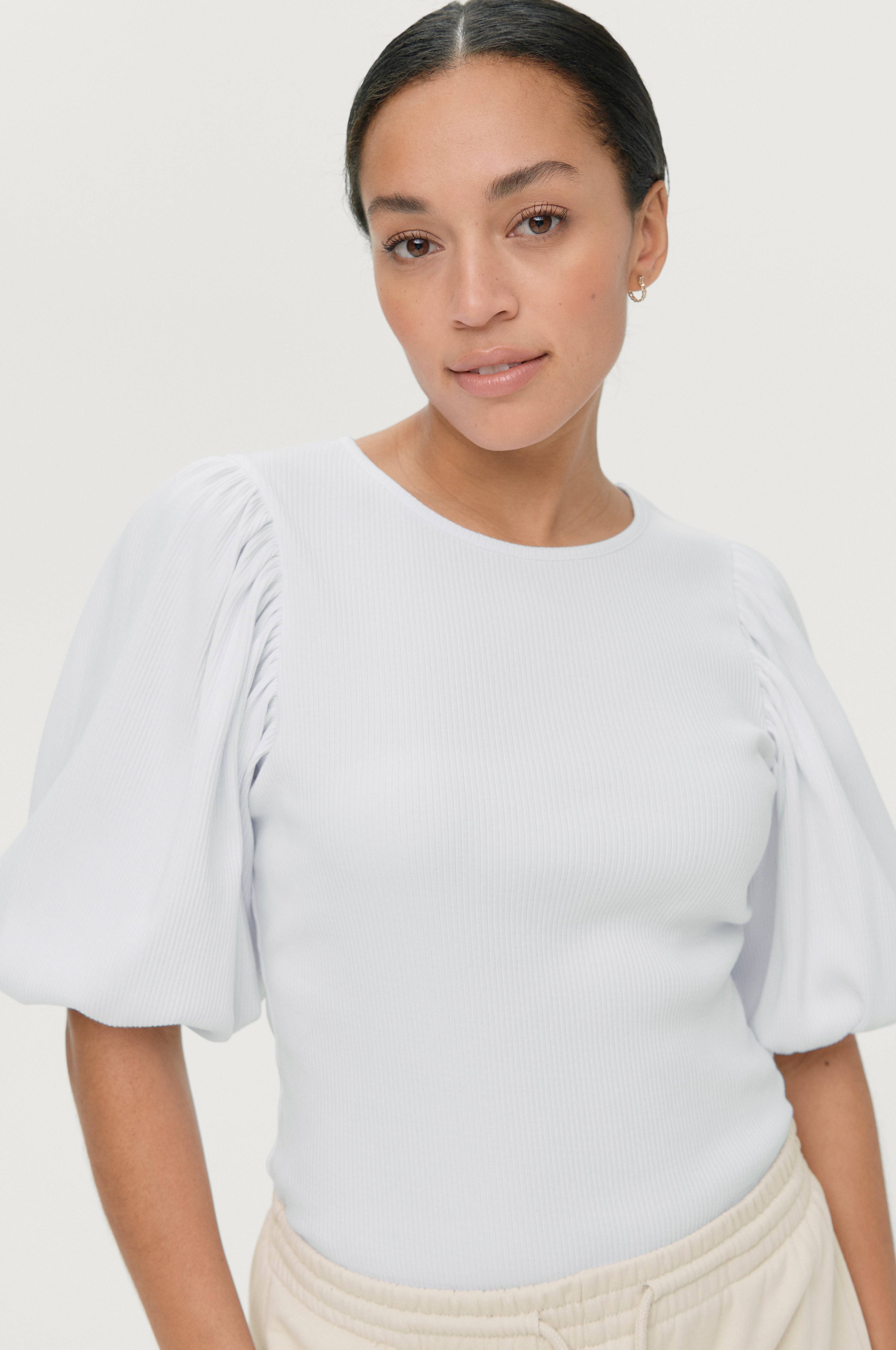 Joustinneuloksinen pusero puuvillatrikoota. Suora malli ja väljät, puolipitkät pussihihat, joissa joustavat hihansuut. Pituus n. 60 cm koossa 34/36.