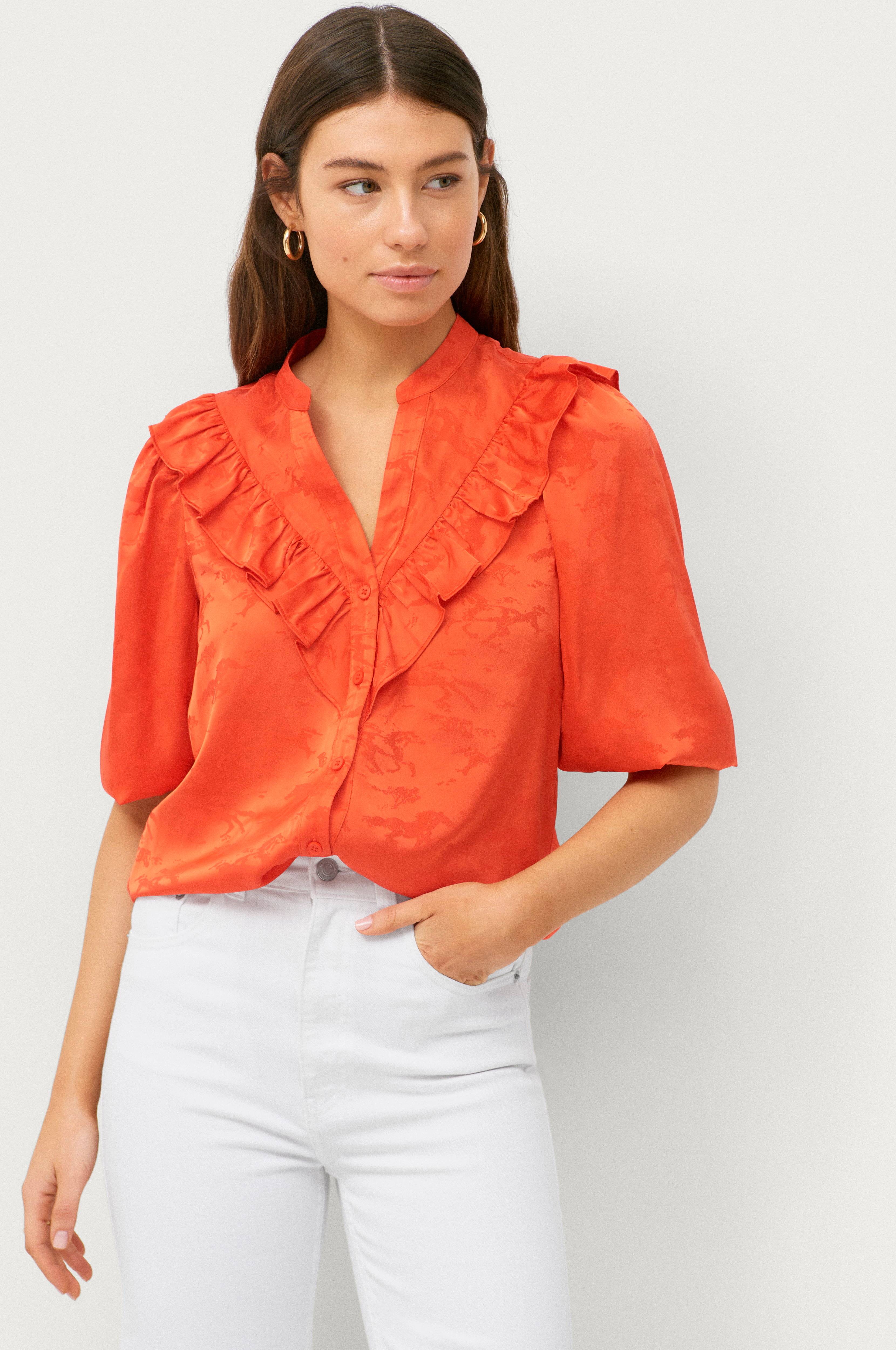 • V-muotoinen kaula • Napit • Röyhelöt hartioiden ympäri ja edessä • Puolipitkät hihat joustonauhalla hihansuissa • Hieman kiiltävä materiaali • Pituus: 63 cm koossa 34/36