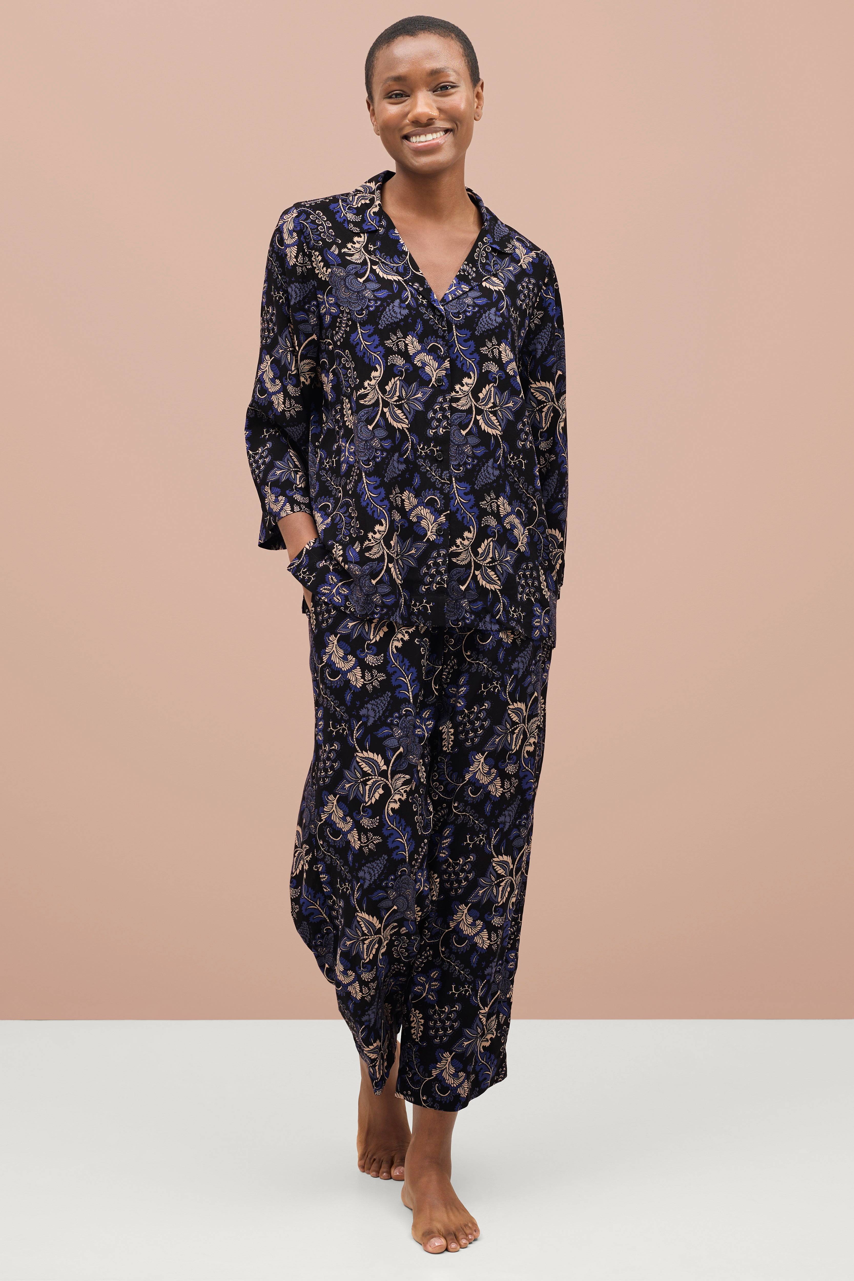 • Pehmeä malli viskoosista • Suora yläosa kauluksella ja napeilla edessä • Leveä, suora hiha • Housut leveillä, suorilla jaloilla • Vyötärönauha upotetulla joustonauhalla