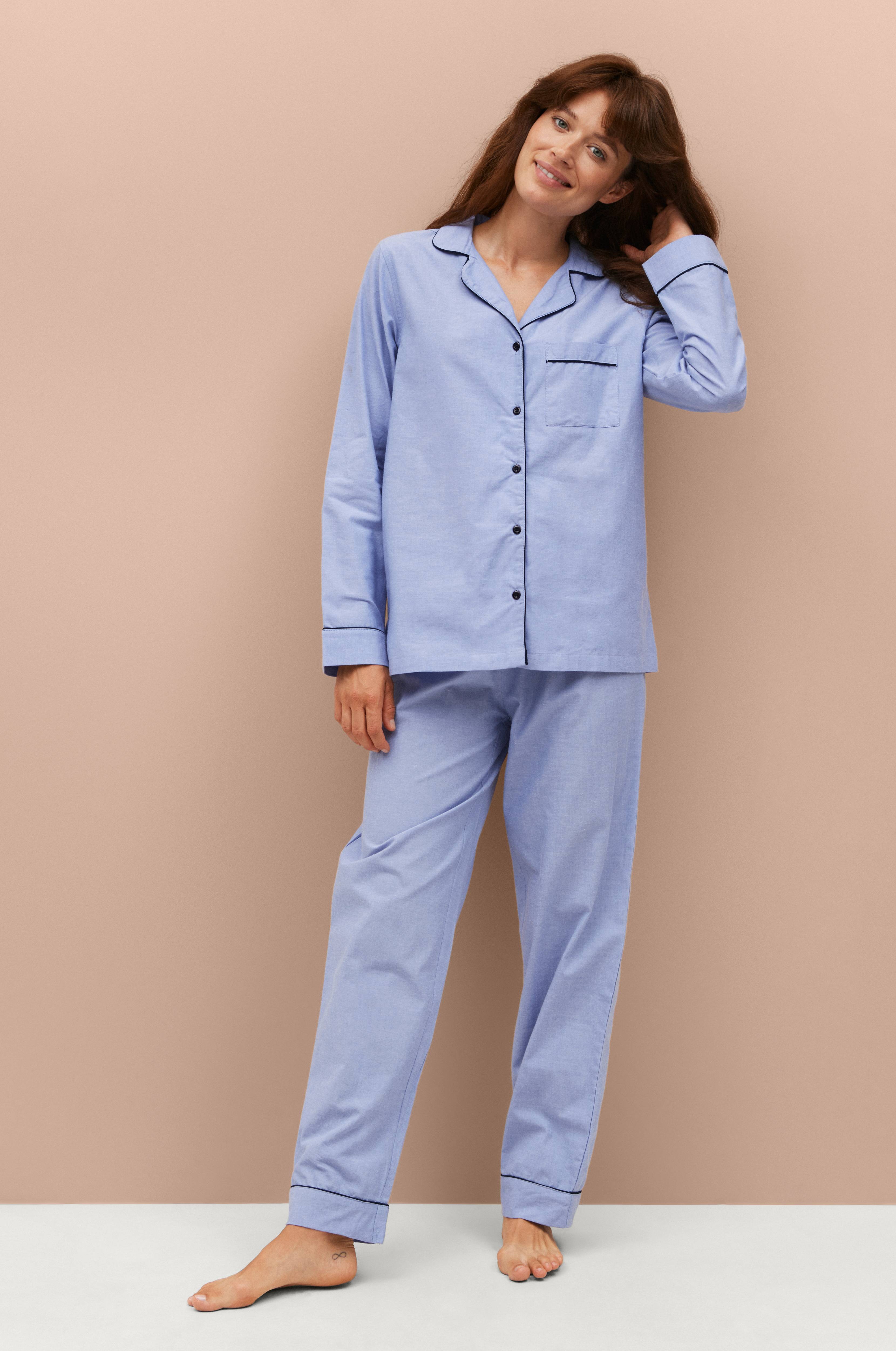 Pyjamahousut puuvillakambrikkia. Väljät suorat lahkeet, joissa yhteensopiva terenauha lahkeensuissa. Vyötärönauhassa upotettu kuminauha ja solmittavat satiininauhat keskellä edessä.