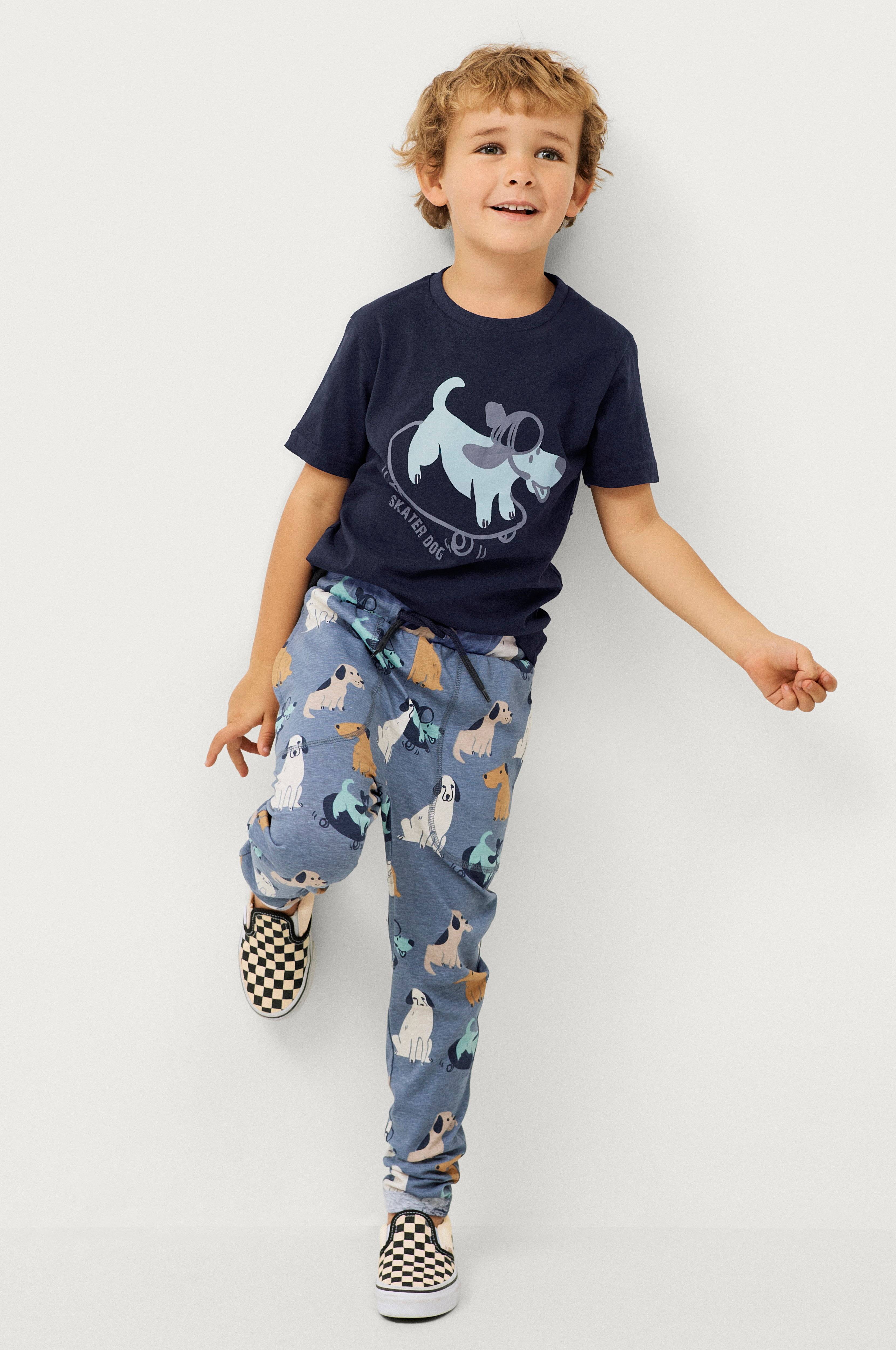 Setti pehmeää puuvillatrikoota. Lyhythihainen T-paita, jossa pyöreä pääntie ja painatus edessä. Housuissa joustava vyötärö, jossa nyöri. Ommeltu käänne lahkeensuissa.