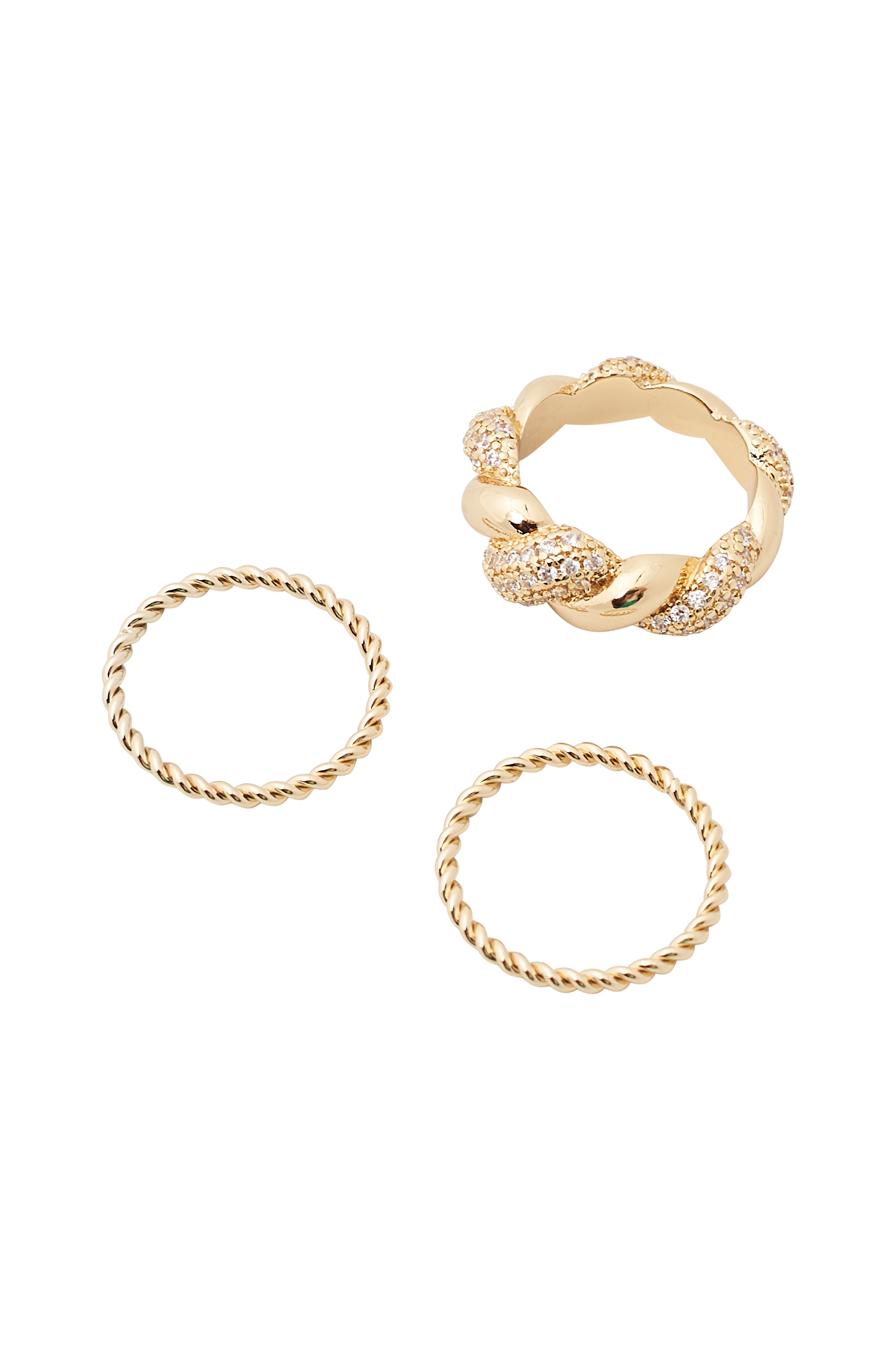 Yksi sormus, jossa kierretty muotoilu ja kimaltavia Cubic zirkonia -kiviä. Leveys n. 0,8 cm.Kaksi ohutta rengasta, joissa kierretty muotoilu. Leveys n. 0,2 cm.