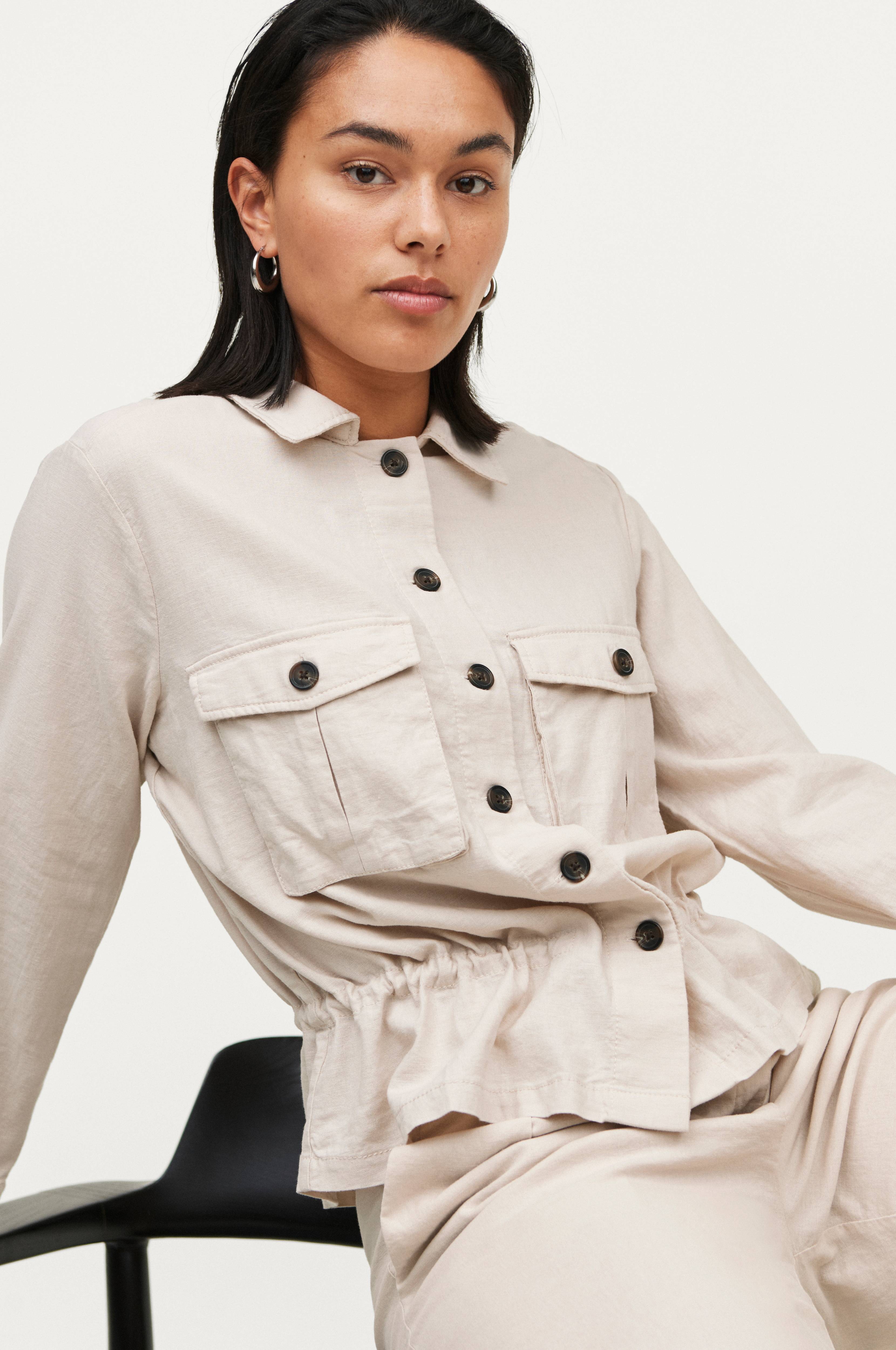 Anita Linen Blazer -takki pellava- ja viskoosisekoitetta. Edessä napit ja kaksi rintataskua. Säädettävä malli, jossa nyöri sisäpuolella helmassa. Pituus n. 57 cm koossa 36.
