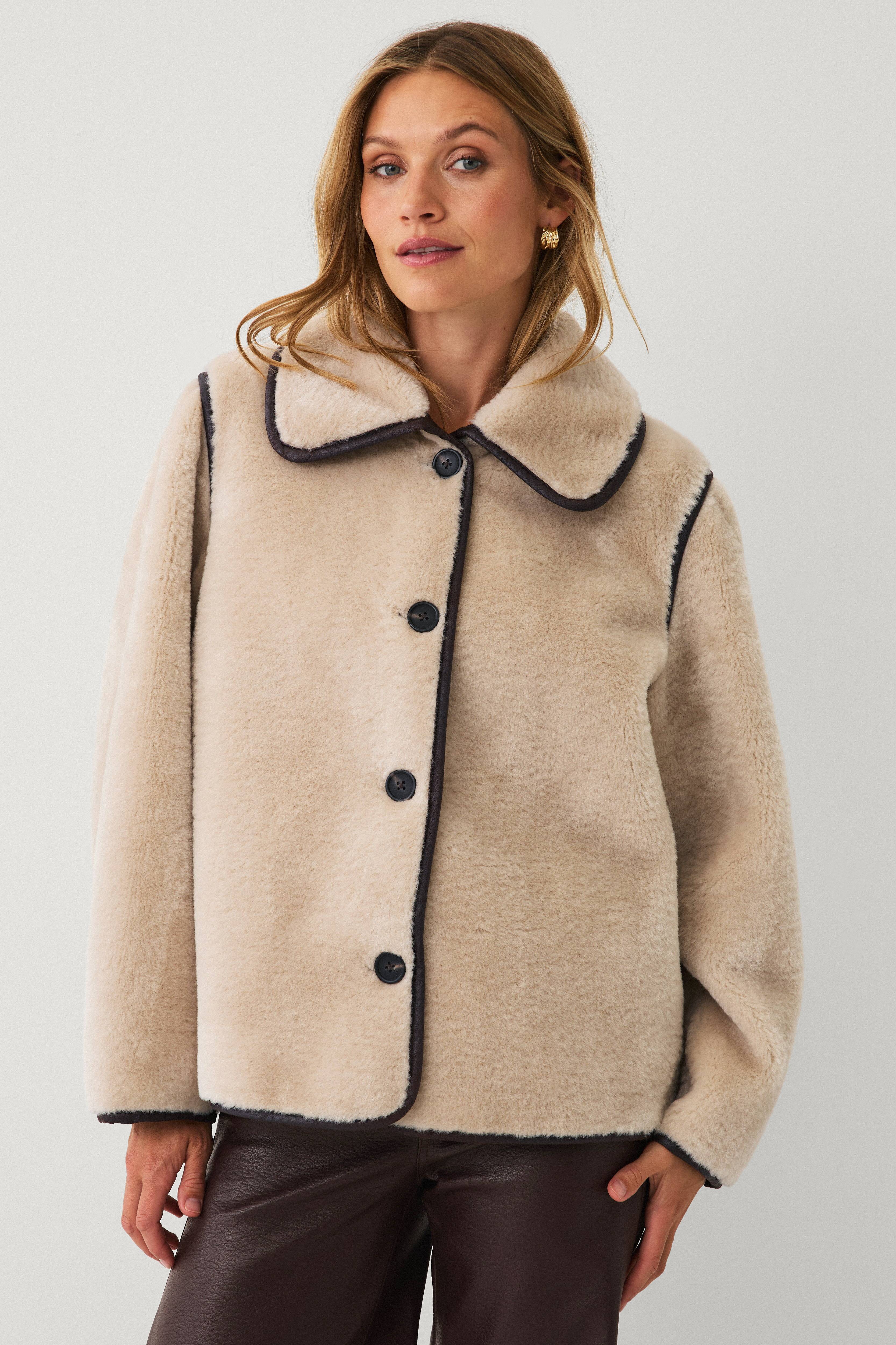 • Pehmeä takki tekoturkiksesta• Tekstiilivuori keinonahasta• Kaulus• Napituslista suoraan eteenpäin• Yksityiskohdat keinonahasta• Sivutaskut• Ylisuuri istuvuus• Pituus: 67 cm koossa S