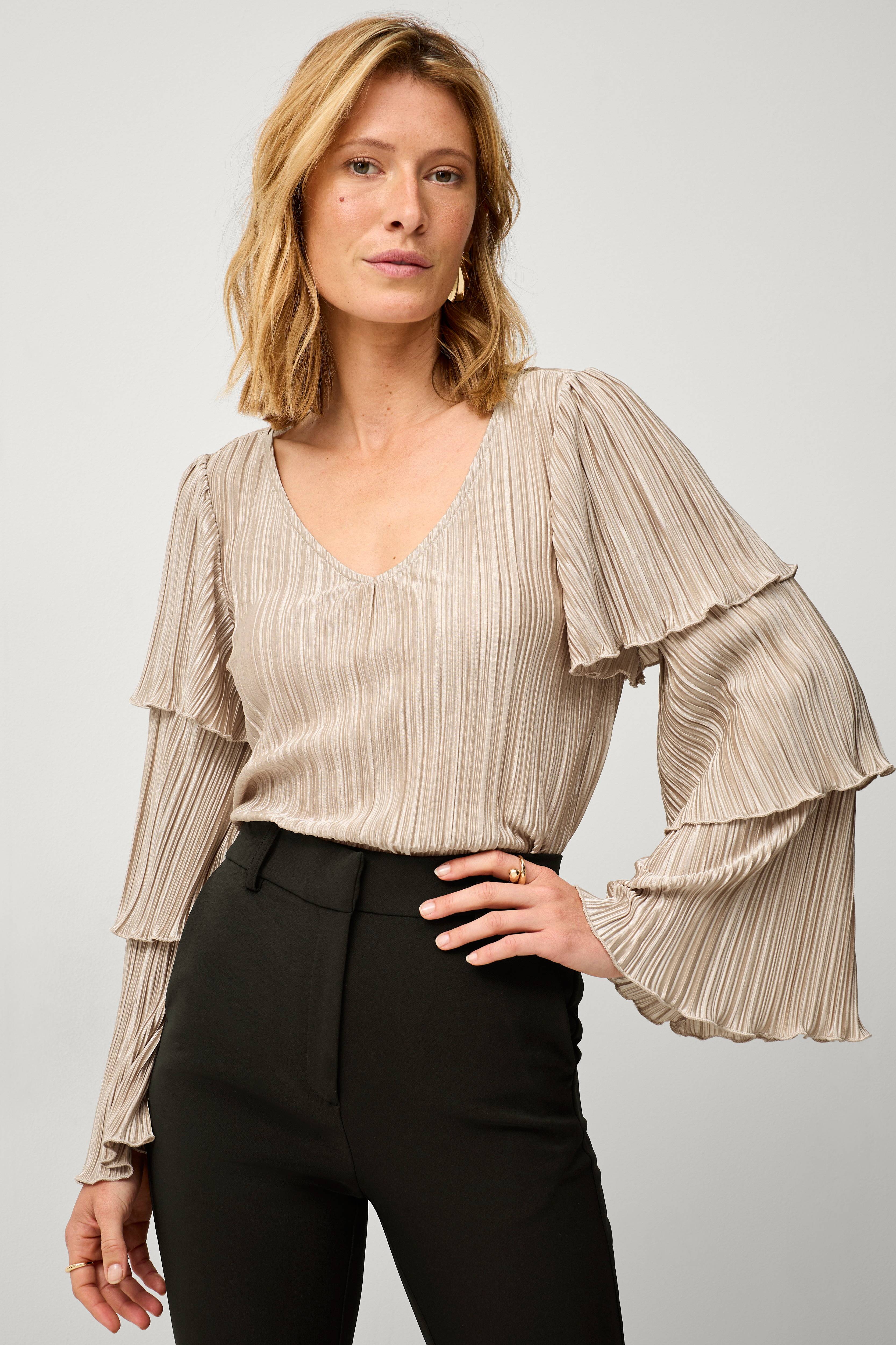 • Toppi laskostetusta trikoosta hohdolla• V-kaula-aukko• Pitkät hihat röyhelöillä• Pituus: 62 cm koossa 34/36