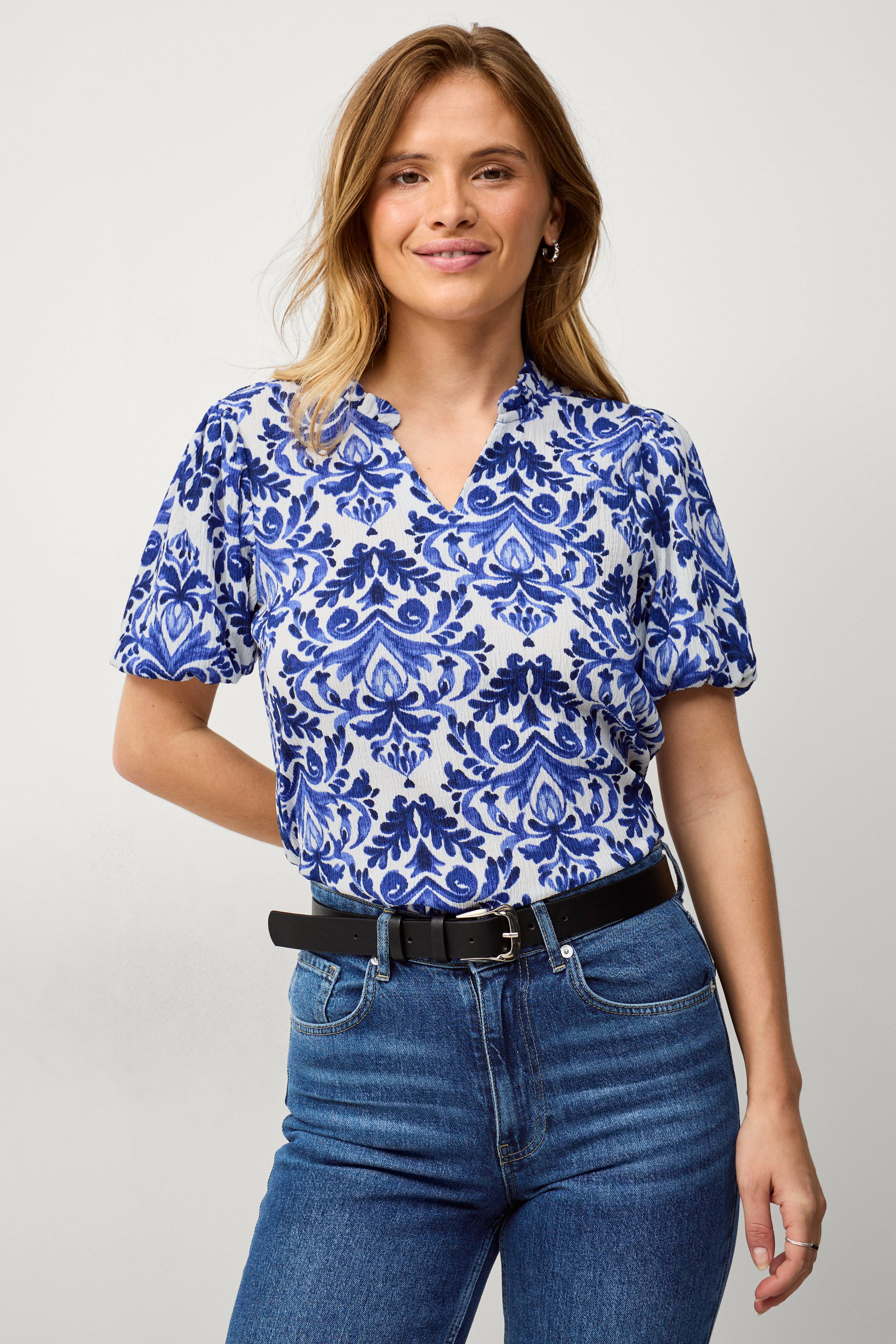 • Kuvioitu toppi sommitelmalla ja joustolla• V-kaula-aukko• Röyhelöreuna kaulassa• Lyhyet bubble-hihat• Pituus: 57 cm koossa 34/36