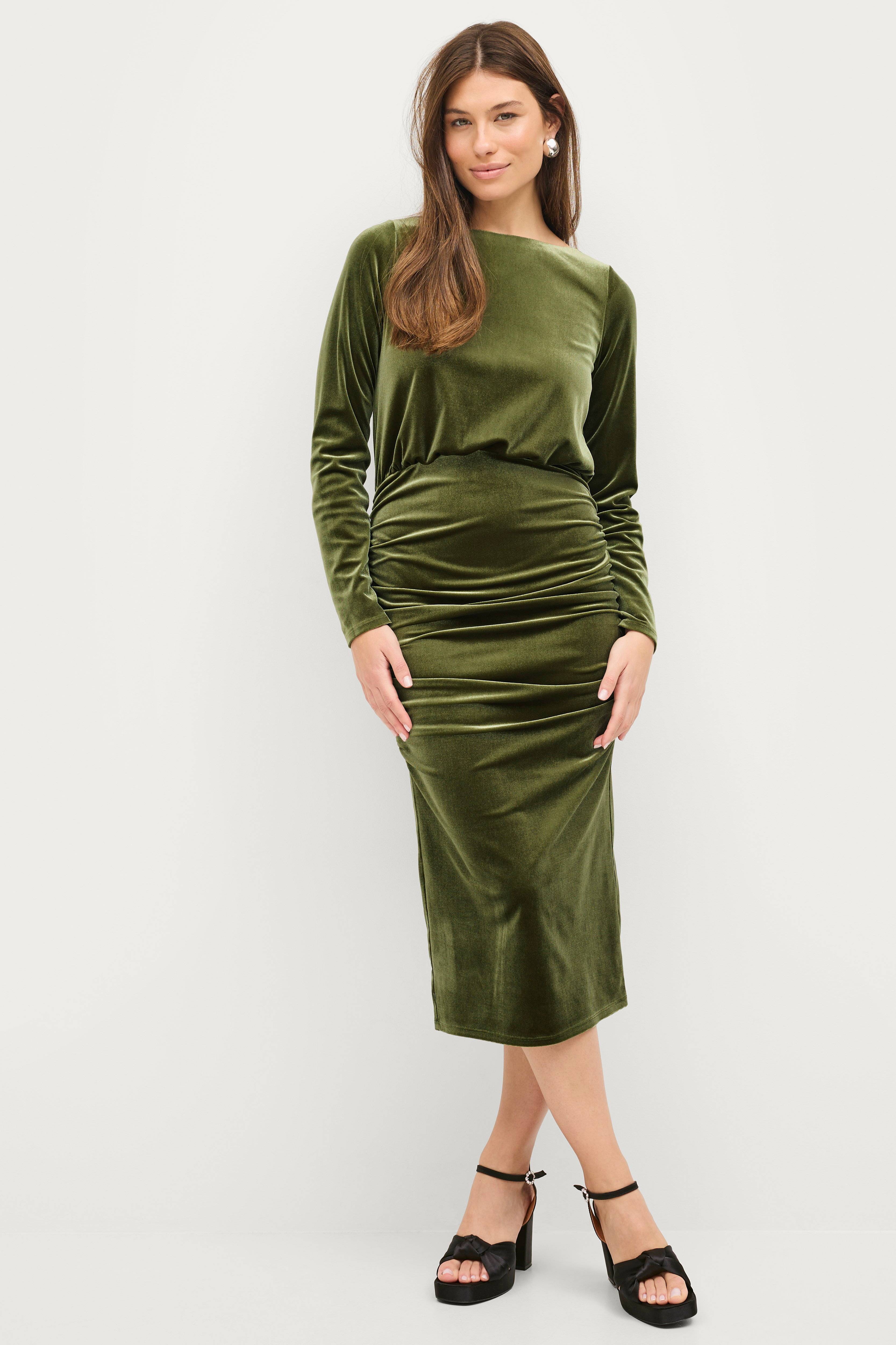 • Mekko veluurista• Ihonmyötäinen malli• Pehmeä, joustava laatu• Poimutettu vyötärö• Drapeeraus sivuilla• Pitkät hihat• Pituus: 116 cm koossa 34/36