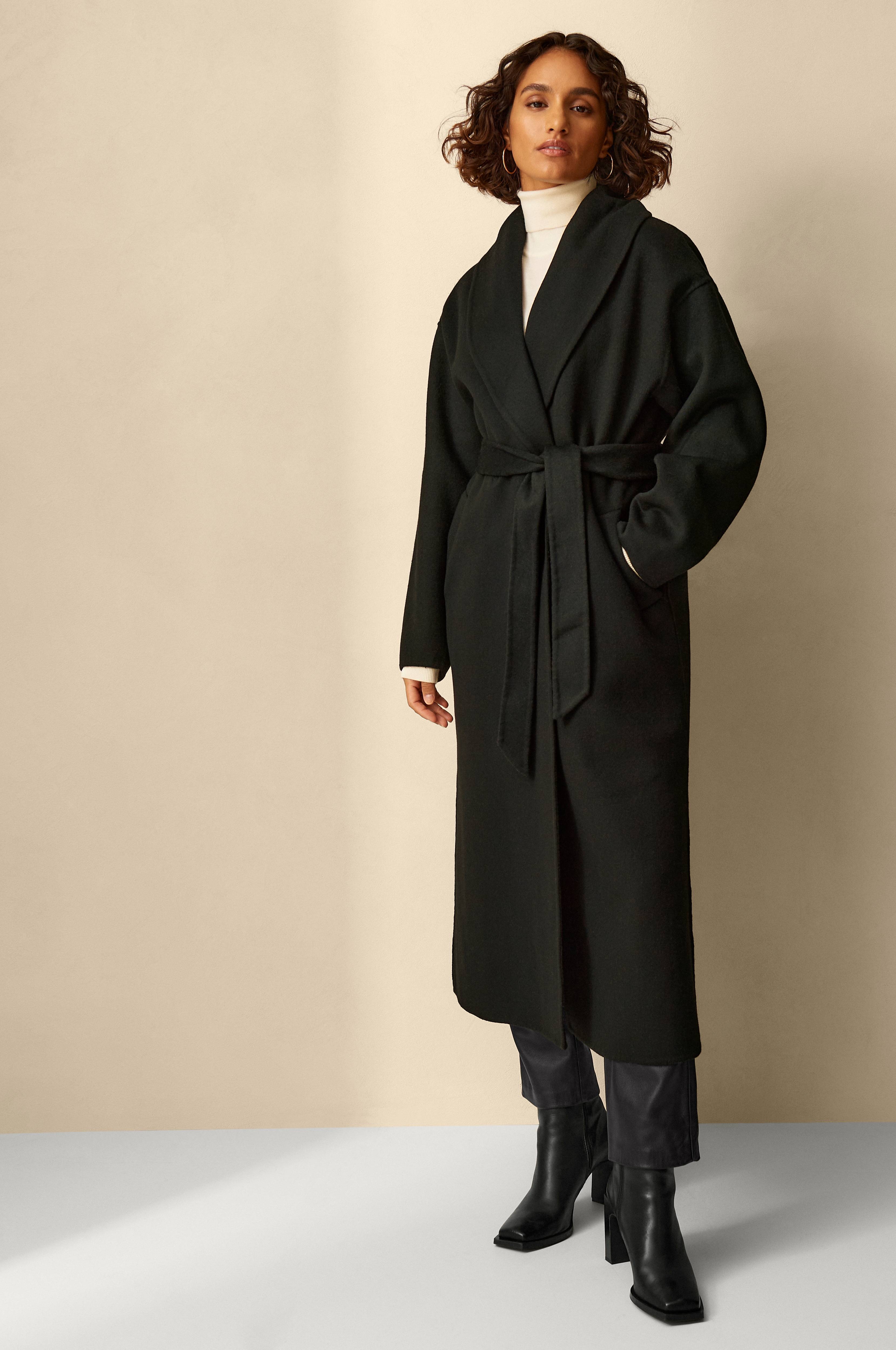 Oversize-mallinen takki laadukasta materiaalia, jossa on 80% RWS-sertifioitua villaa. Käsintehdyt päärmeet ilman näkyviä saumoja. Osin vuorillinen. Piilopainonapit. Kaksi taskua. Irrotettava solmimisvyö vyötäröllä. Helmassa sivuhalkiot. Pituus n. 128 cm koossa 34/36.