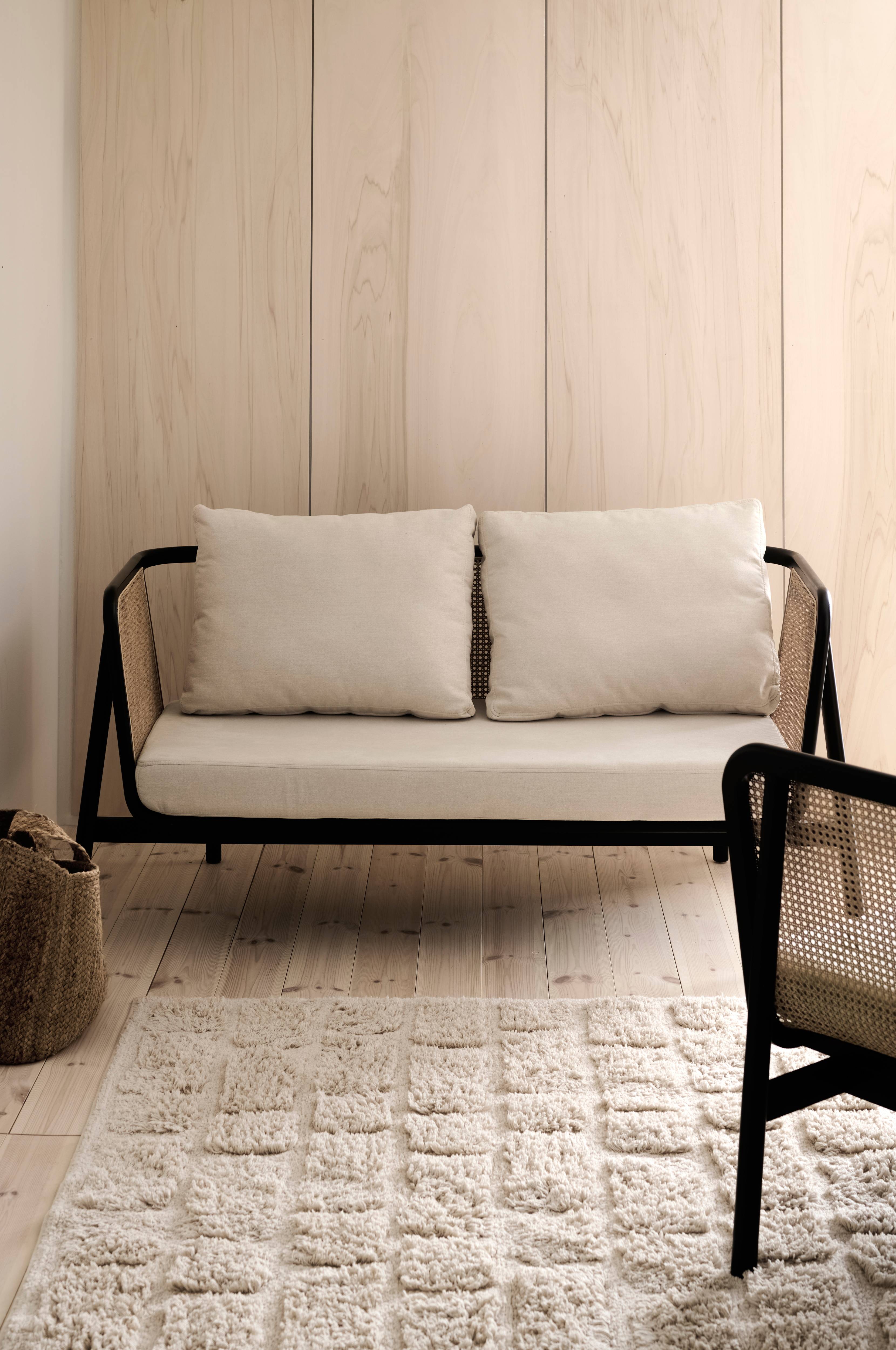 Sohva maalattua pyökkiä ja vaneria, sivut rottinkia. Istuinpehmusteessa ja selkätyynyissä irrotettava polyesteripäällinen. Täyte: Istuinpehmusteessa vaahtomuovia ja selkätyynyissä puuvillakuitua. Istuinsyvyys 43 cm (istuinsyvyys ilman selkätyynyjä 65 cm). Istuinleveys 142 cm. Käsinojan korkeus lattiasta 78 cm. Tila huonekalun alla (jalkojen korkeus) 22 cm. Toimitetaan koottuna.