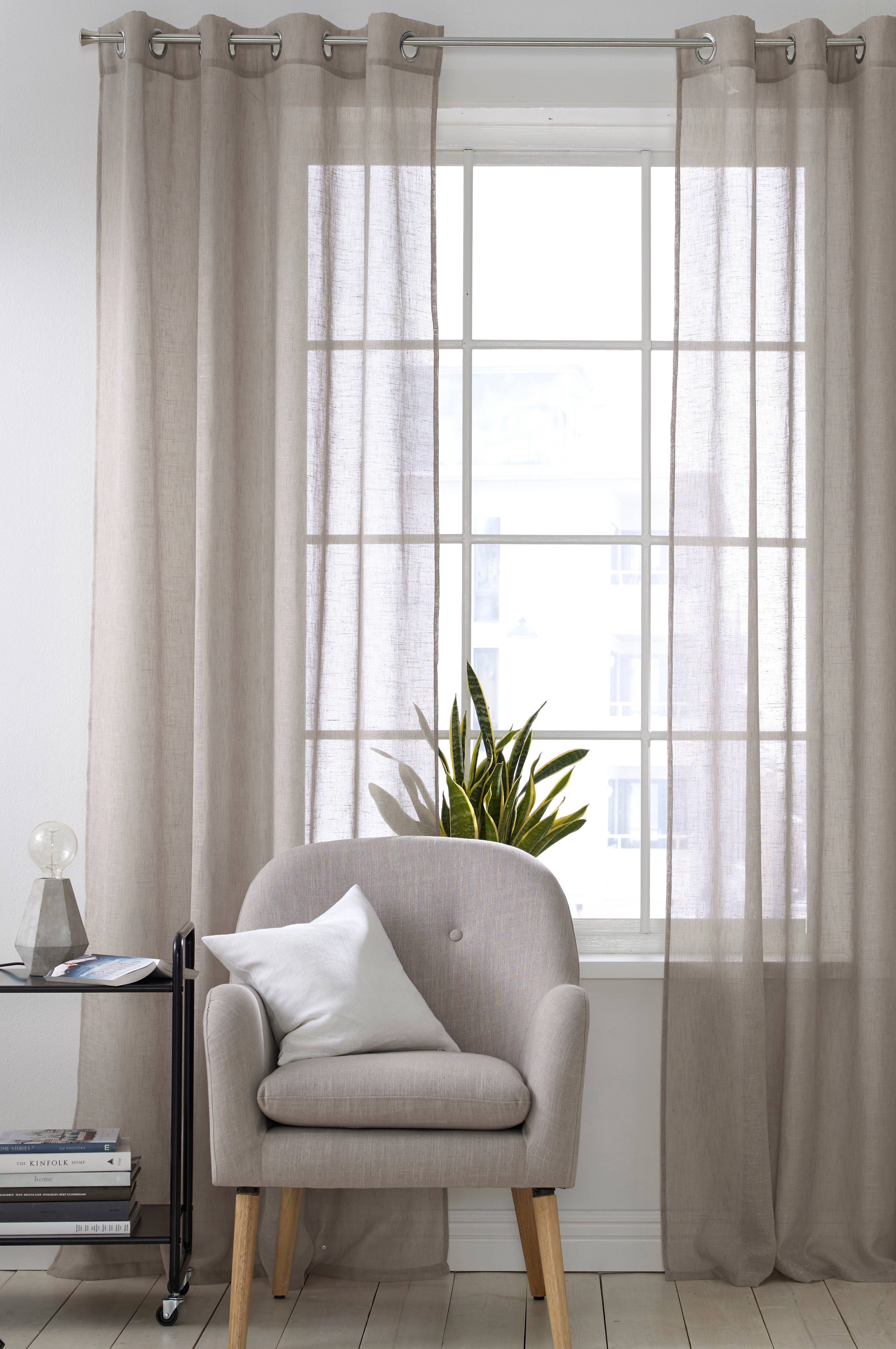 Renkaat hopeanväristä metallia. Pellavantuntuinen eläväpintainen voilee 85% polyesteriä ja 15% pellavaa. Pesu 30°. Leveys 140 cm. Kaksi eri pituutta: 220 & 250 cm.