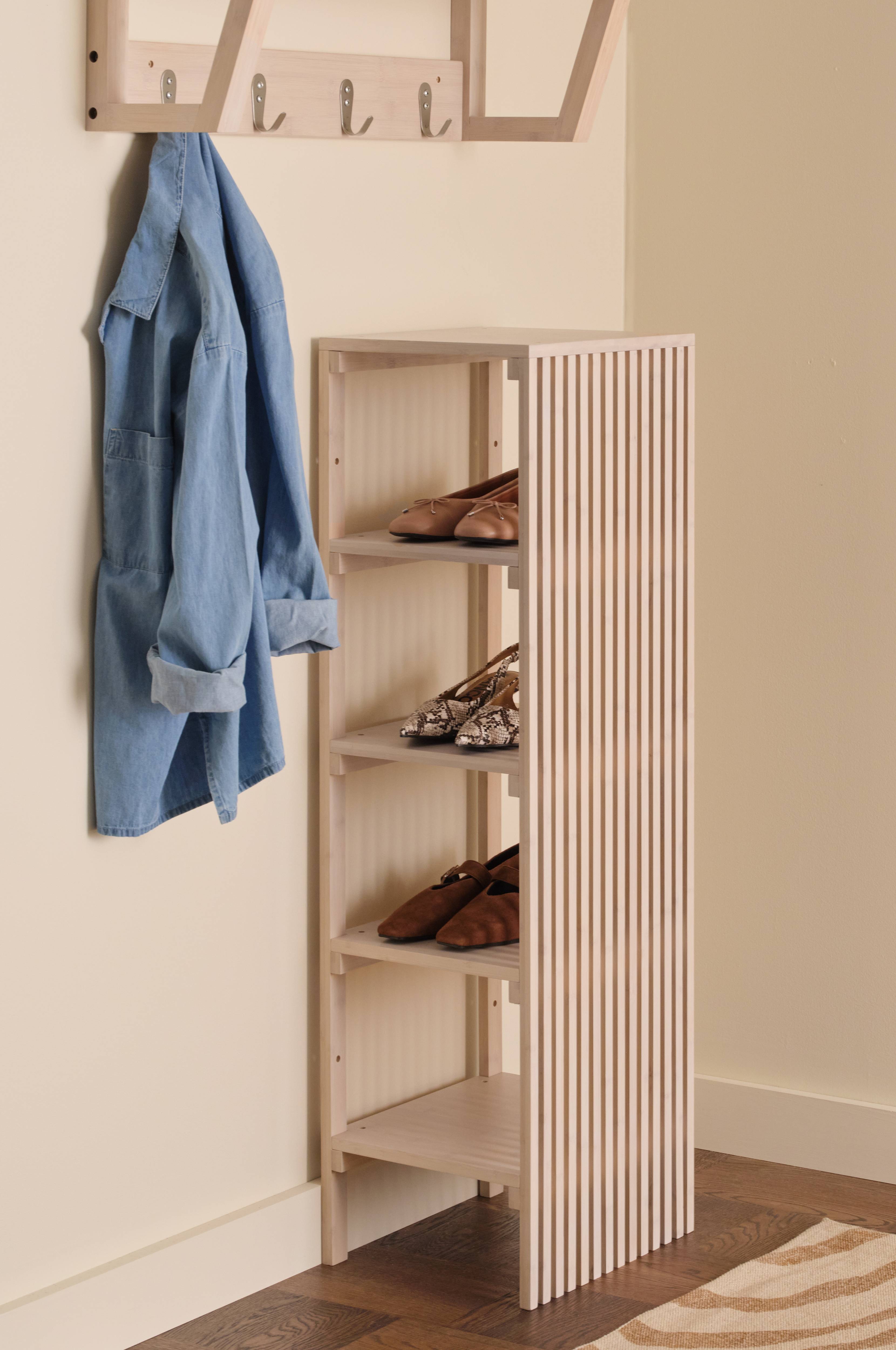 • Eteisen varastointi neljällä hyllyllä• Valmistettu bambupuusta• Ribattu sommitelma yhdellä sivulla• Hyllyjen välinen etäisyys: 22 cm• Kiinnitetään seinään